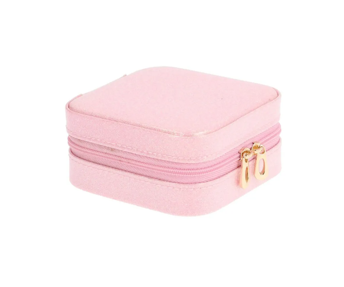 Guarda todos tus cumplementos preferidos bien ordenados en este precioso joyero con acabado de purpurina y cierre de cremallera, gracias a su interior compartimentado.