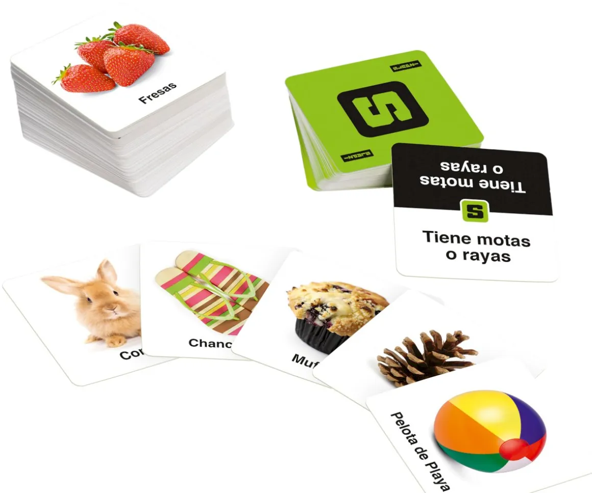 - Incluye: 120 cartas de imagen a doble cara, 65 cartas de pista