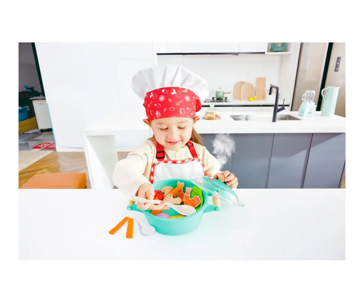 A los peques les encantará imitar como cocinan los mayores con esta olla de vapor de Hape. Reproduce efectos de sonidos burbujeantes y una neblina que parece vapor real.Solo deberás añadir unas gotitas de agua con la pipeta que incluye.