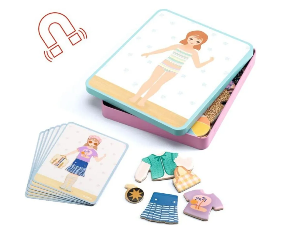 - Incluye: 1 estuche metálico ilustrado a doble cara, 38 piezas magnéticas de madera, 6 tarjetas de patrones doble cara