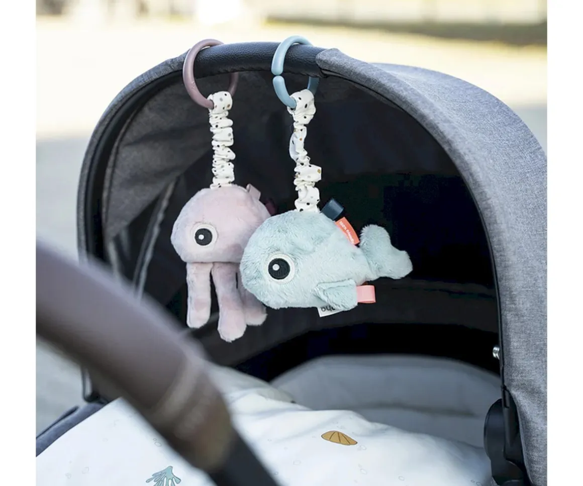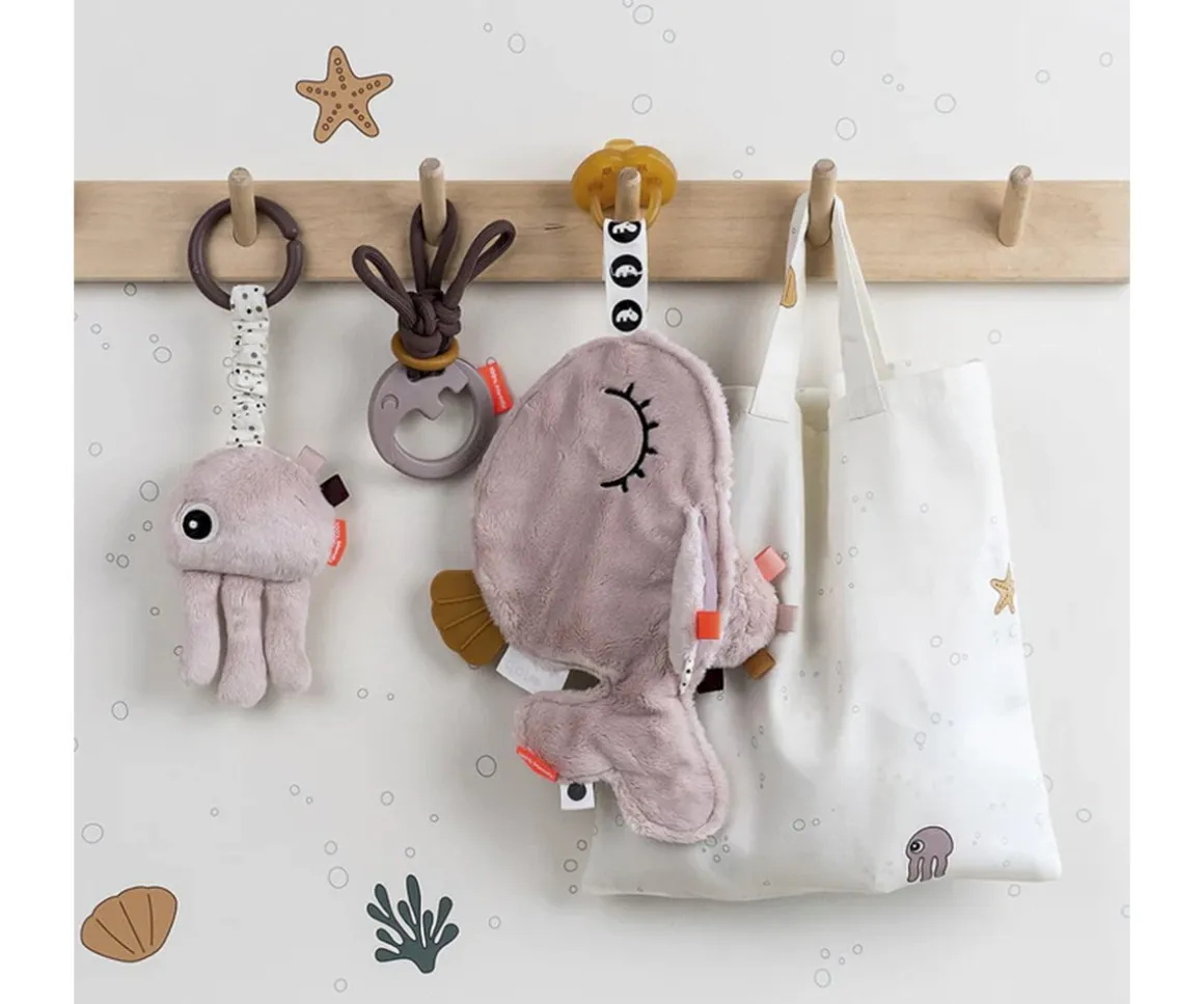 Esta pequeña medusa suave y acogedora, viene en un tono rosa empolvado con detalles dorados y etiquetas de colores. ¡El compañero perfecto para tu pequeño explorador!