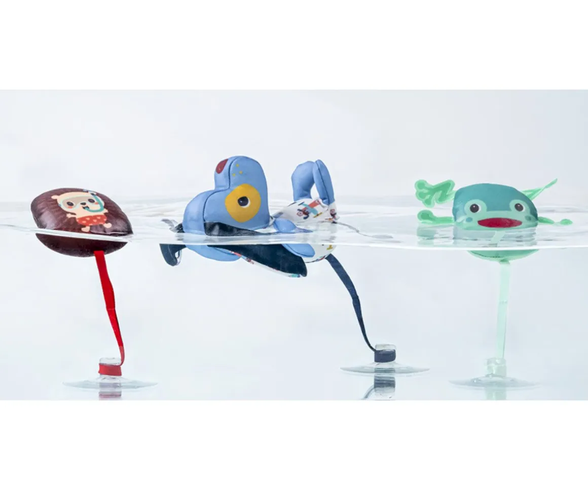 El perrito Jules de Lilliputiens y sus dos amigos: una rana y el erizo Leon, se divierten en el agua y con su ventosa podrán sujetarse en la bañera, en la pared del baño o en el cristal.