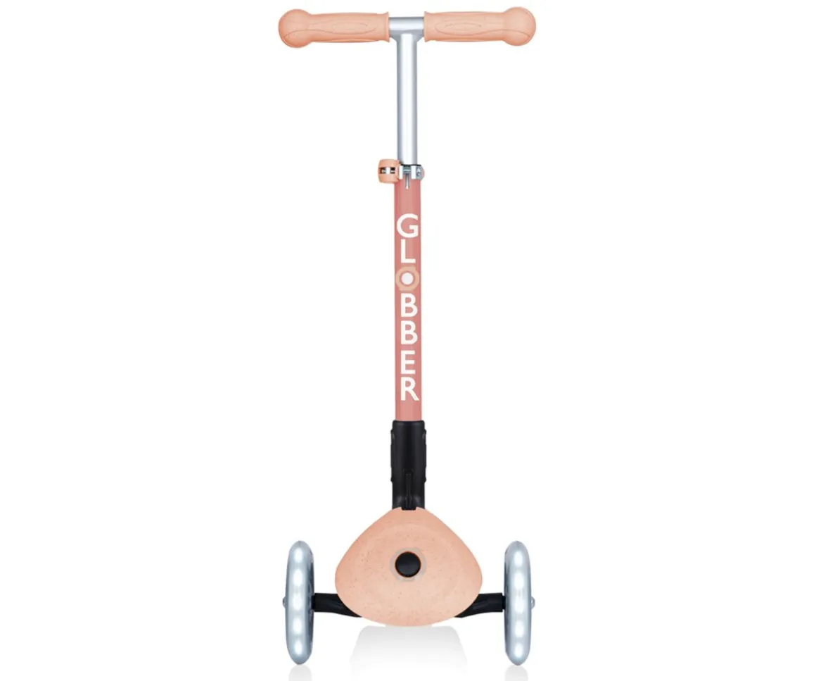 El patinete infantil Junior Foldable Lights es ecológico y está fabricado con un 60% de plástico reciclado. Tiene 3 ruedas, bloqueo de dirección y un sistema de plegado y barra en T ajustable. La misma estructura pero con materiales más ecológicos.