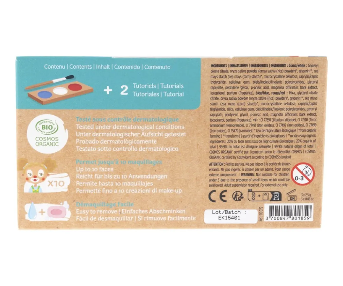 Kit de maquillaje hipoalergénico y orgánico certificado, al agua, que contiene una paleta de 3 colores.