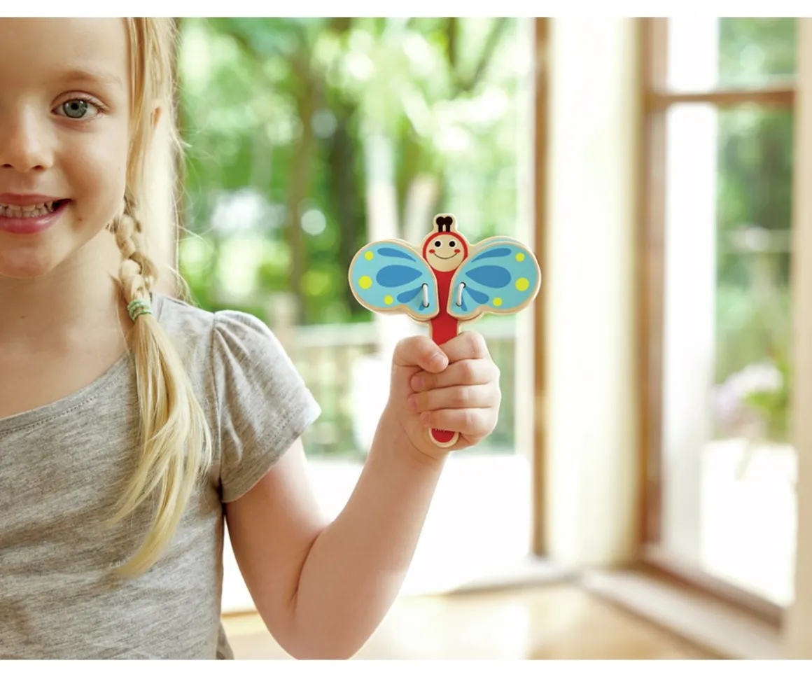 - Incluye: una mariposa castañuela, una maraca abeja, una campana luciérnaga, un xilófono flor y una pandereta rana