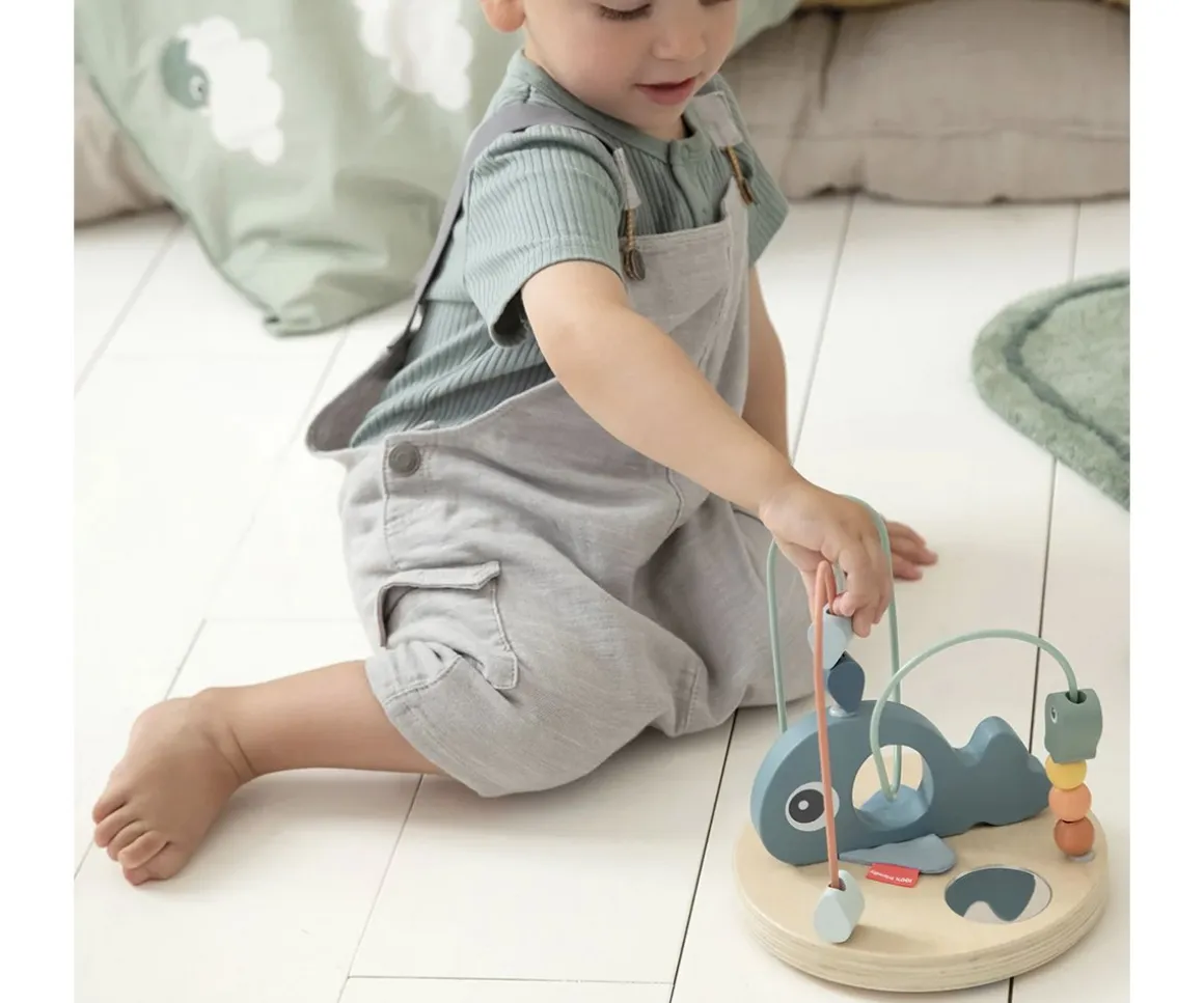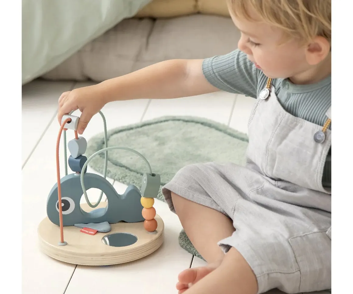 Divertido laberinto de cuentas de madera de la bonita ballena Wally dónde tu peque practicará las habilidades finas y agarre de pinza mientras mueve las cuentas pequeñas. Sus divertidos colores y el espejo que incluye hará que el bebé tenga curiosidad e interactúe con él.