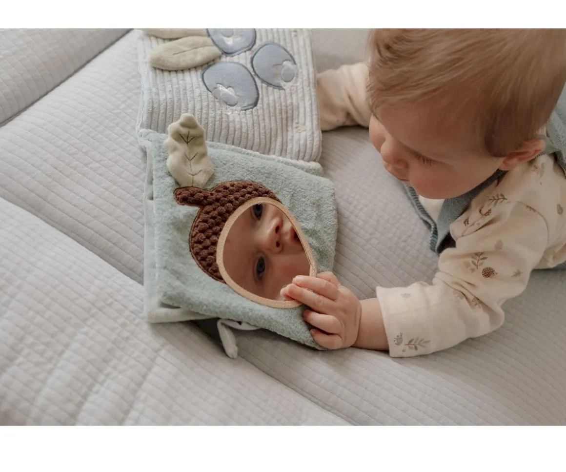 Detallado con divertidas etiquetas, texturas rugosas y animalitos de la colección Forest Friends, el juguete de actividad estimulará los sentidos. También tiene un espejo para autodescubrimiento.