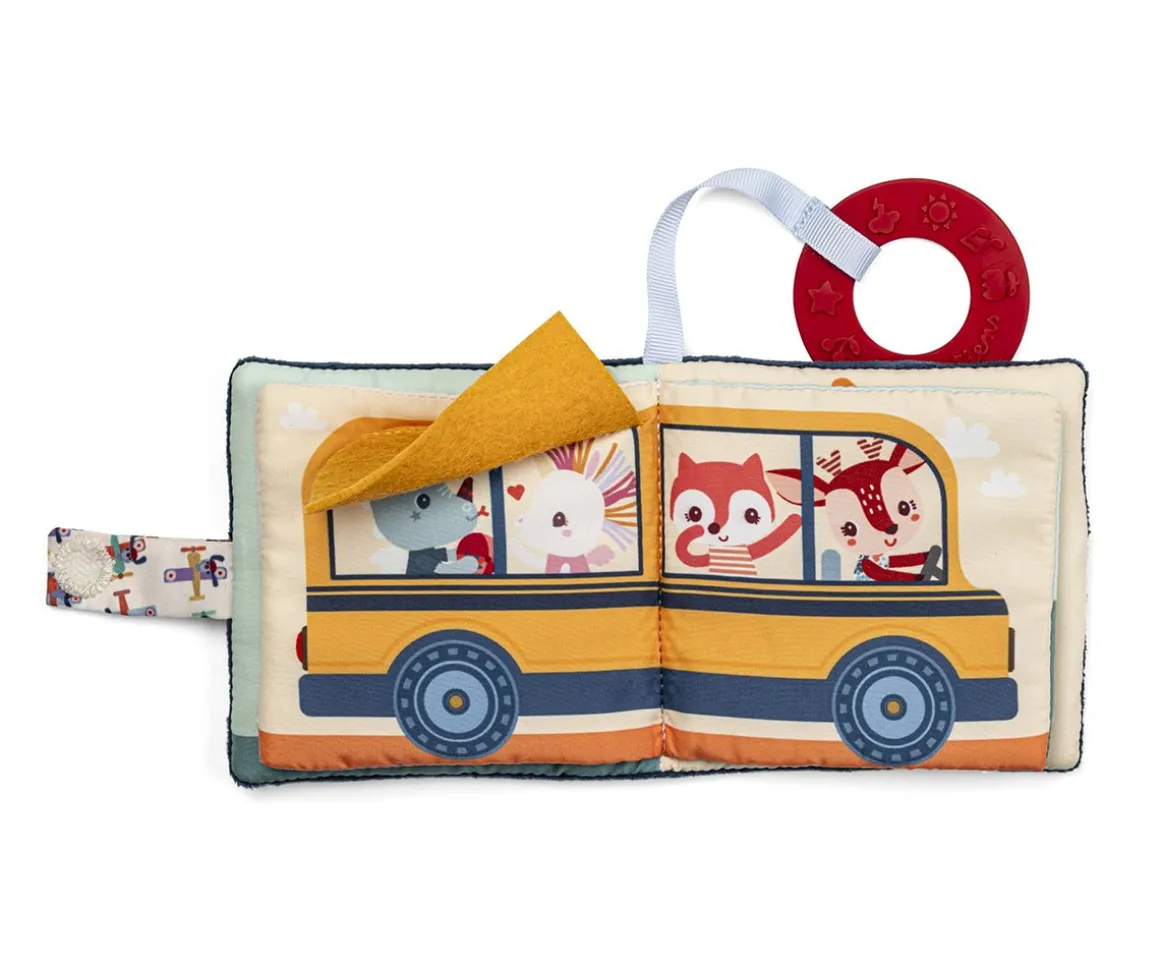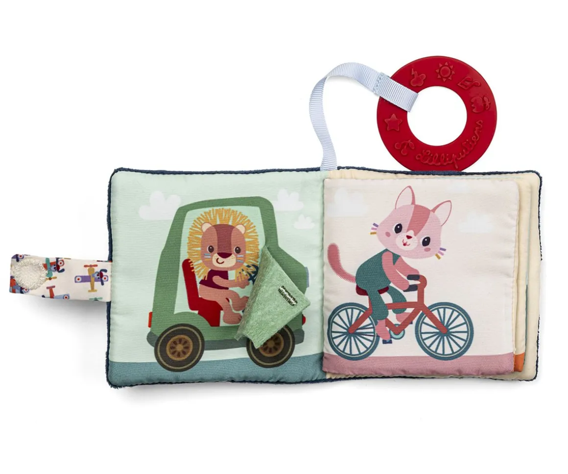 Este librito de Lilliputiens cuenta la historia del perro Jules junto a sus amigos en diferentes medios de transporte. A medida que el peque pase las páginas descubrirá que se esconde en cada vehículo. Incluye un mordedor para aliviar la boca del bebé.