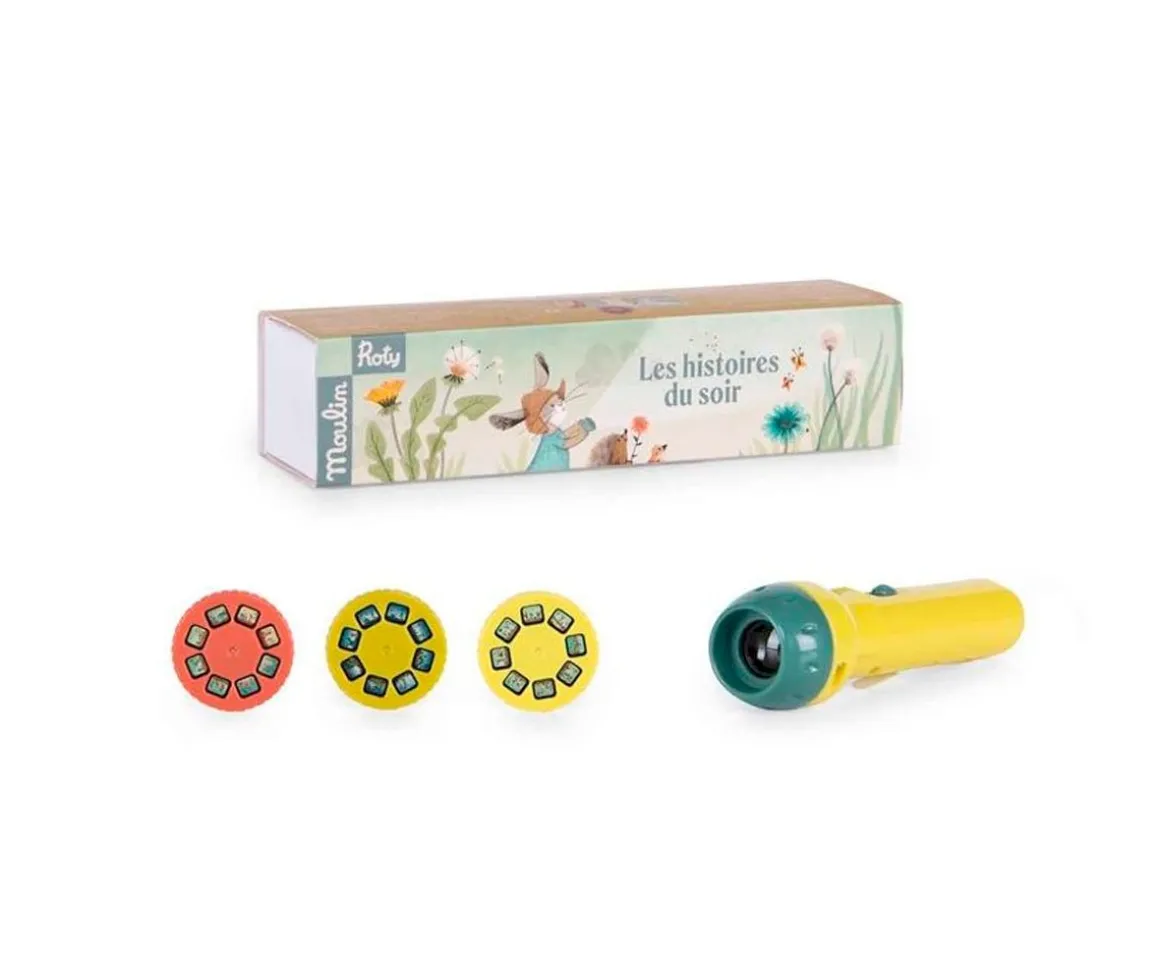 Se compone de una pequeña linterna (lleva las pilas incluidas) a la que se le pueden insertar tres ruedas con diferentes imágenes. Las preciosas ilustraciones proyectadas en la pared, el techo o en cualquier otra superficie, nos darán pie para inventar cuantas historias queramos.