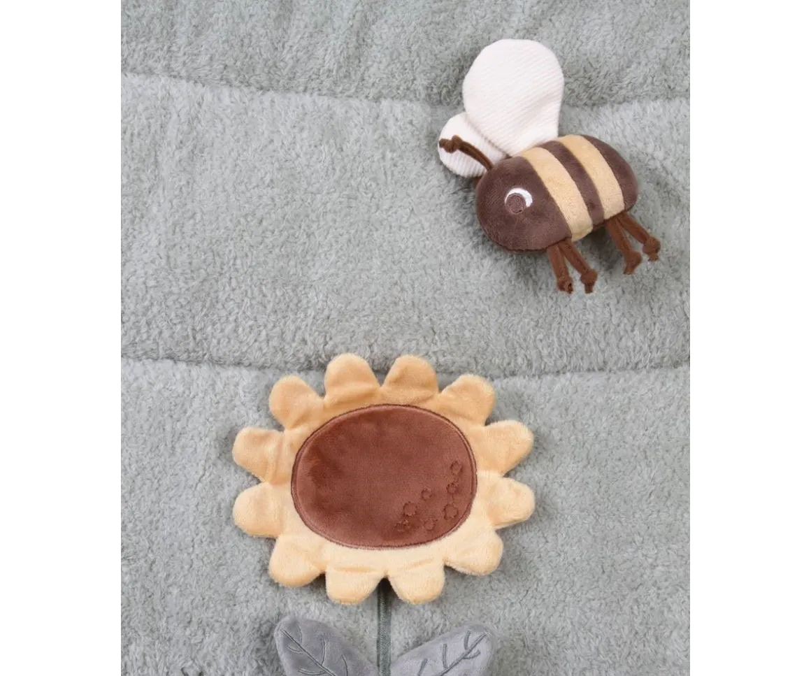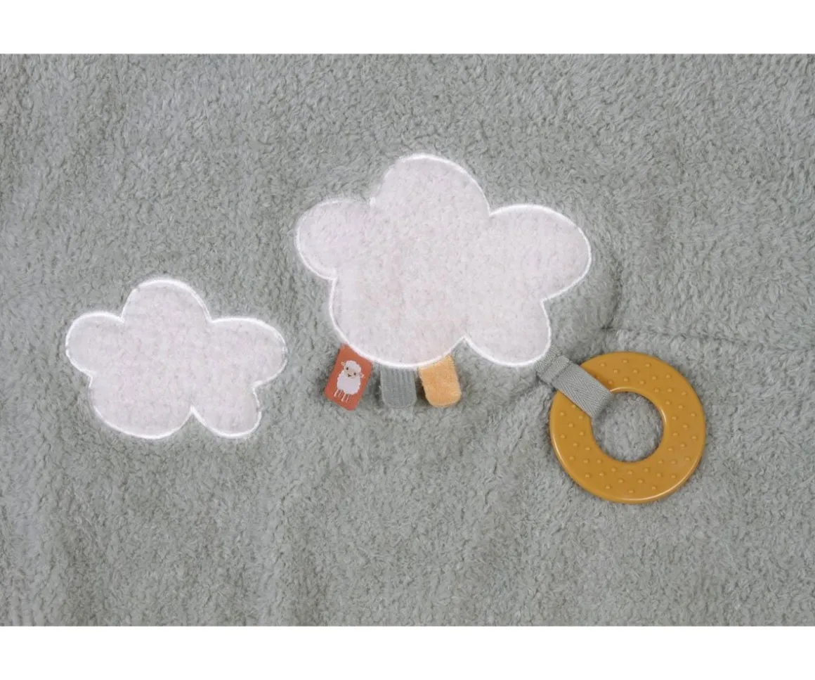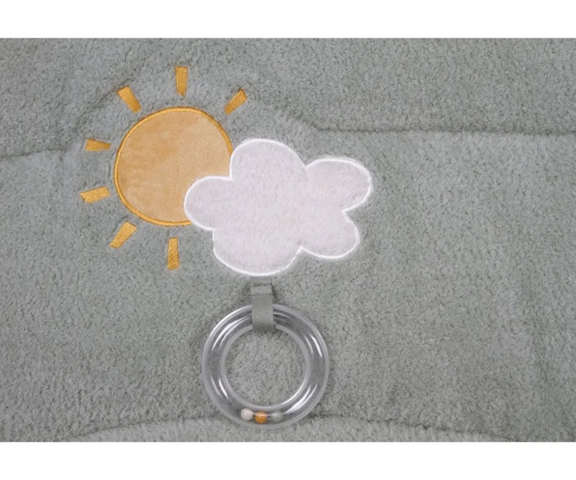 Esta manta acolchada está llena de texturas y características que estimularán sus sentidos. Hecho para horas de entretenimiento,las alitas de la gallina hacen un sonido crujiente, y puedrán descubrir lo que se esconde debajo de ellas. Las nubes tienen una suave tela de peluche y hay varias etiquetas por descubrir. Incluye un anillo de dentición que ayudará a los peques con sus encías.