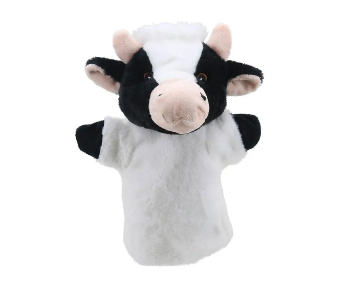 Esta marioneta de vaca en blanco y negro, de una suavidad exquisita, es la compañera perfecta para el juego simbólico y es especialmente ideal para dar vida a canciones y rimas infantiles.