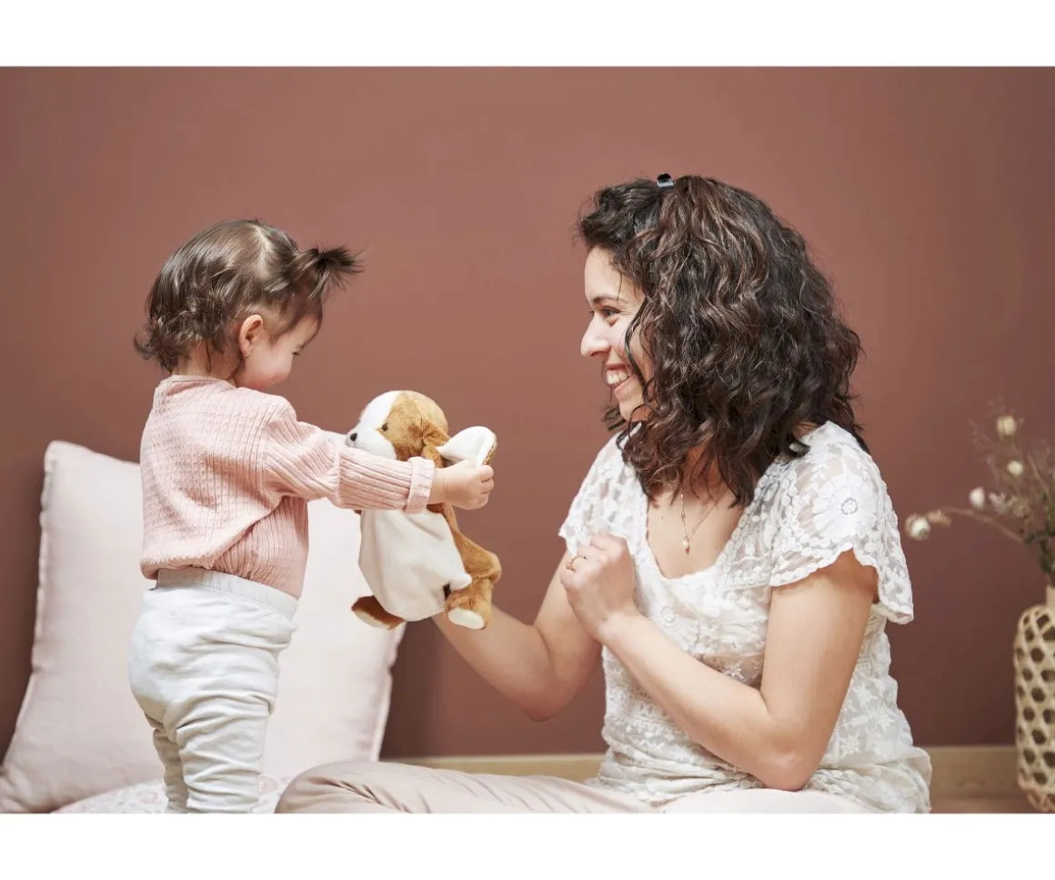 Esta suave marioneta del perrito llamado Tiramisú con largas orejas y pequeñas patas, es fácil de manejar y perfecta para estimular la imaginación de los pequeños. Además, facilita la creación de vínculos afectivos entre padres e hijos. ¡Que empiece el espectáculo y la imaginación con esta encantadora marioneta de perrito!