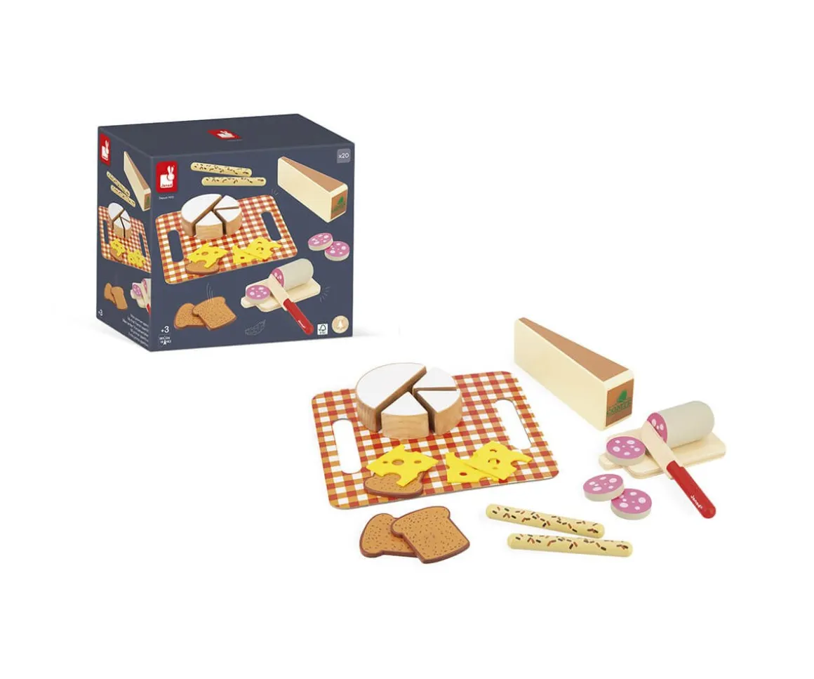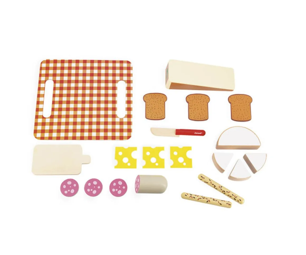- Incluye: un queso y sus dos piezas precortadas, tres rebanadas de pan de molde,3 rebanadas de emmental en fieltro amarillo, dos palitos de pan, un cuchillo, una bandeja de cartón vichy rojo y blanco y una tabla de cortar de madera