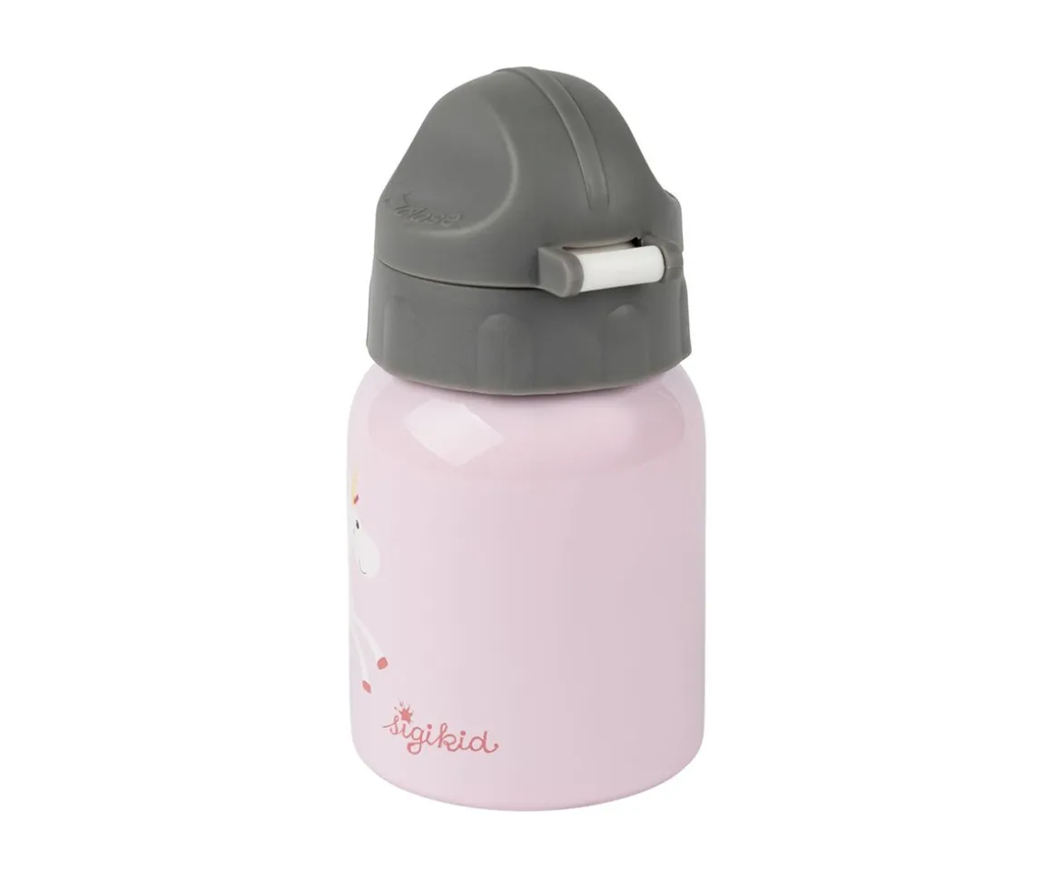 Mini botella de acero inoxidable con capacidad de 250 ml y estampado con diseño de un agradable unicornio de Sigikid. Ideal para el colegio o excursiones, fácil de abrir y con tapón deportivo para un uso cómodo para los peques.
