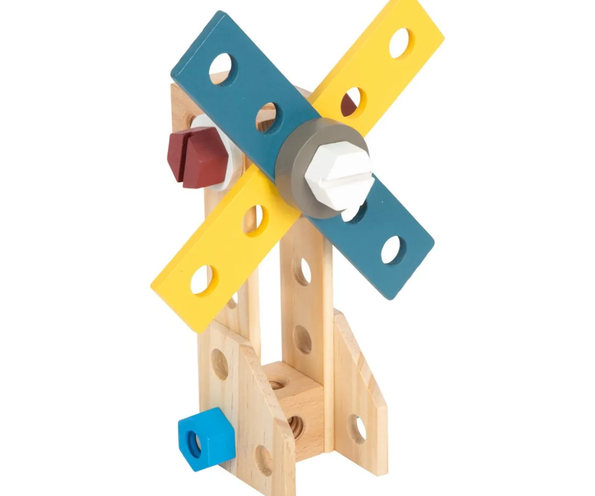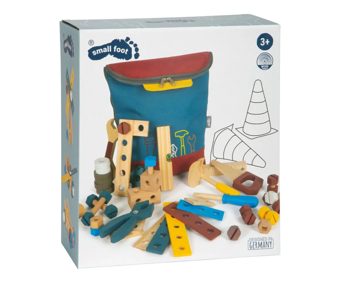 - Incluye: 1 mochila de herramientas, 1 martillo, 1 llave inglesa, 1 destornillador, 1 alicate, 1 sierra, 1 regla plegable, 1 nivel de burbuja, 1 tope, 4 listones perforados grandes, 2 listones perforados medianos, 2 listones perforados pequeños, 2 listones perforados romboidales, 2 listones perforados cuadrados, 11 tornillos, 12 tuercas, 2 ruedas dentadas, 2 arandelas finas, 4 arandelas gruesas