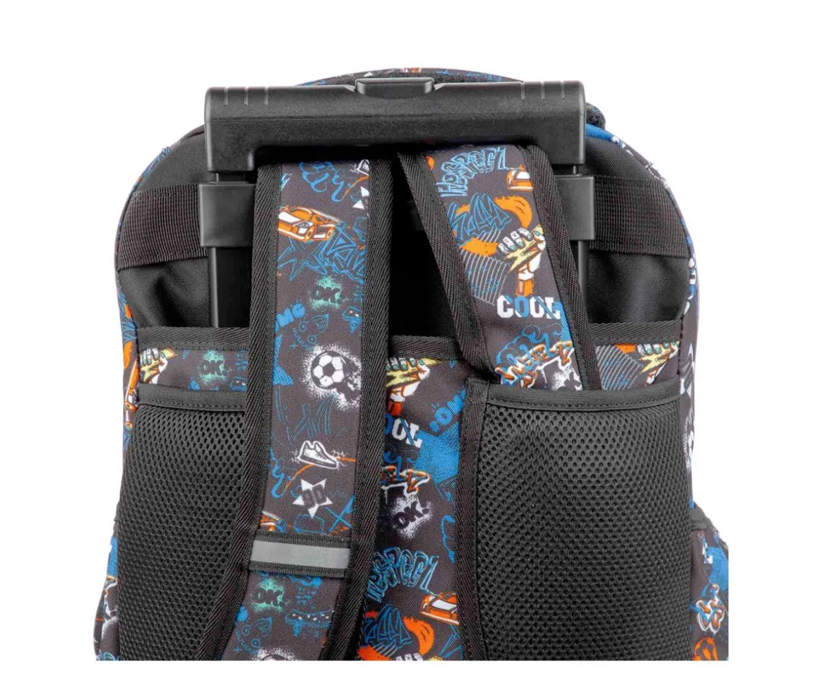 Su diseño con carro integrado, doble barra y tirantes acolchados la hace muy versátil, perfecta tanto para llevarla rodando como a la espalda. Cuenta con dos compartimentos principales de gran tamaño, su base es rígida y resistente, protegiendo el contenido contra golpes, mientras que los dos bolsillos laterales permiten llevar botellas de agua de forma segura.