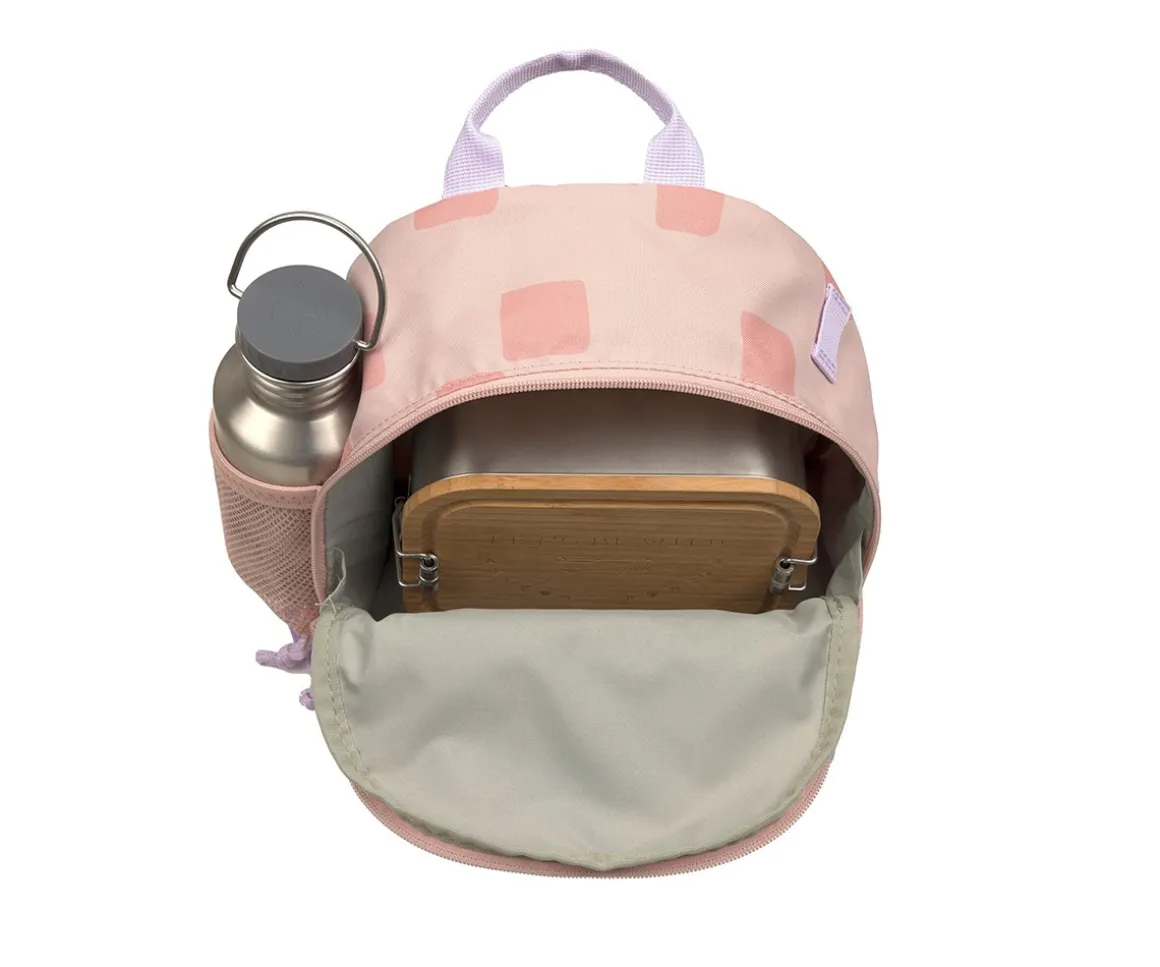 Mochila infantil de la colección Pattern Party de LÄSSIG, ideal para el cole o excursiones. Confeccionada en material repelente al agua, cuenta con un amplio compartimento principal, bolsillo inferior impermeable para la comida, bolsillo lateral de malla para la botella y un bolsillo frontal para objetos pequeños. Práctica y funcional para el día a día.
