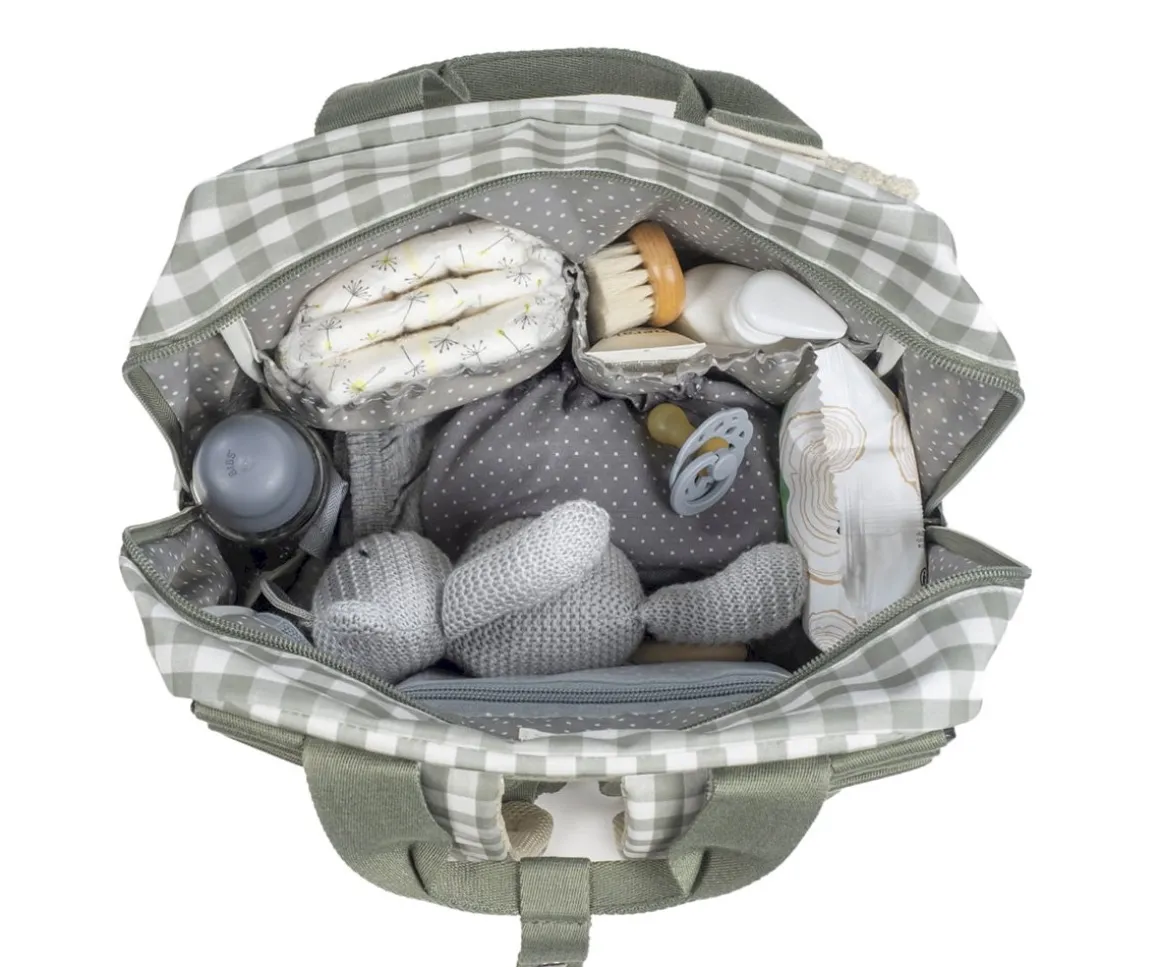 Mochila que además es una bolsa canastilla muy ligera, resistente y de gran capacidad de la colección Caetana cuadros vichy en color Stone de Walking Mum, para llevar todo lo necesario para el paseo del bebé. El bolso incluye 2 asas cortas ajustables que facilitan la colocación en cualquier modelo de silla de paseo, asas de mano y correas acolchadas para colgar en la espalda y llevarla contigo cómodamente.