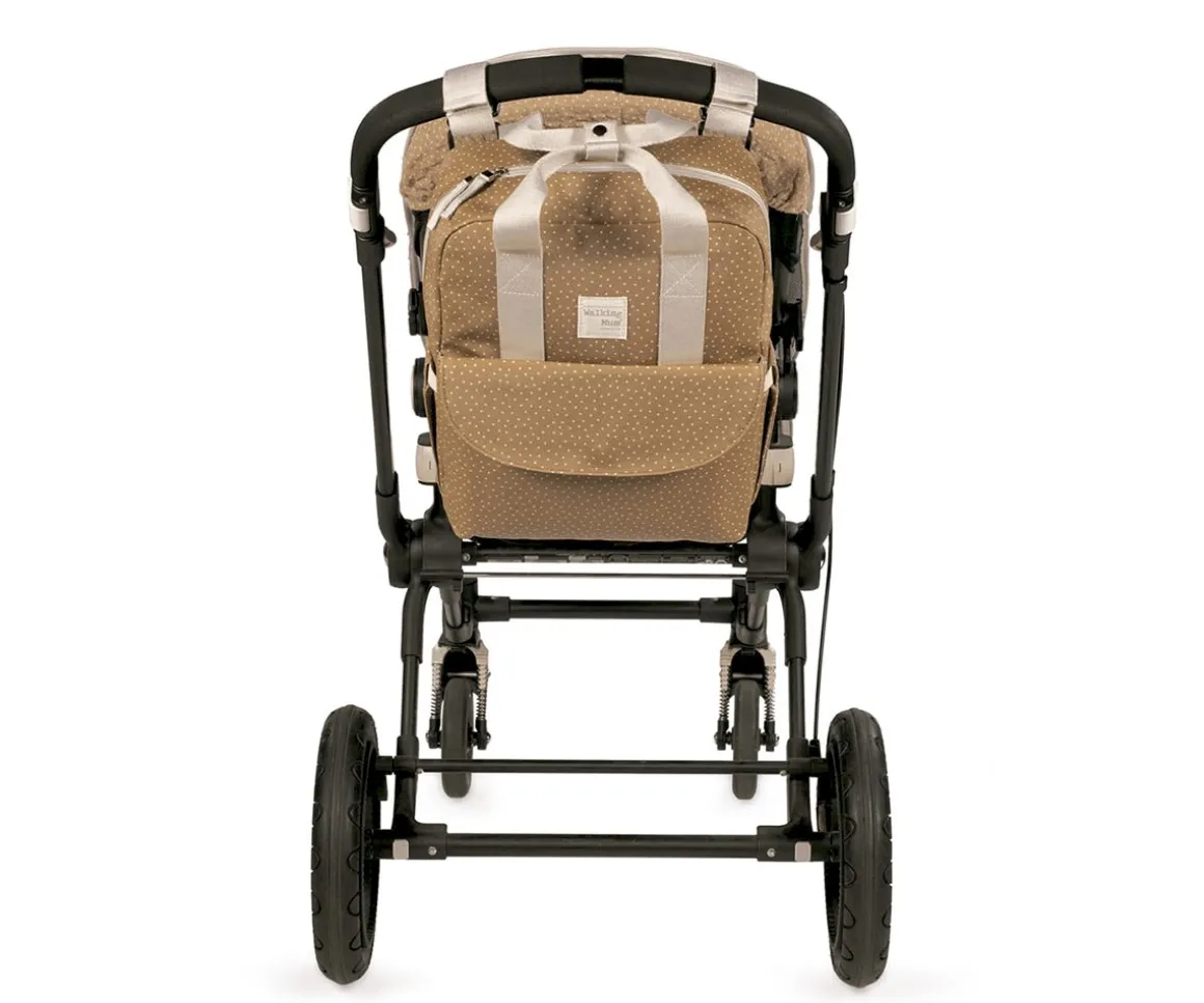 Mochila que además es una bolsa canastilla muy ligera, resistente y de gran capacidad de la colección lunares Poppy canela de Walking Mum, para llevar todo lo necesario para el paseo del bebé. El bolso incluye 2 asas cortas ajustables que facilitan la colocación en cualquier modelo de silla de paseo, asas de mano y correas acolchadas para colgar en la espalda y llevarla contigo cómodamente.