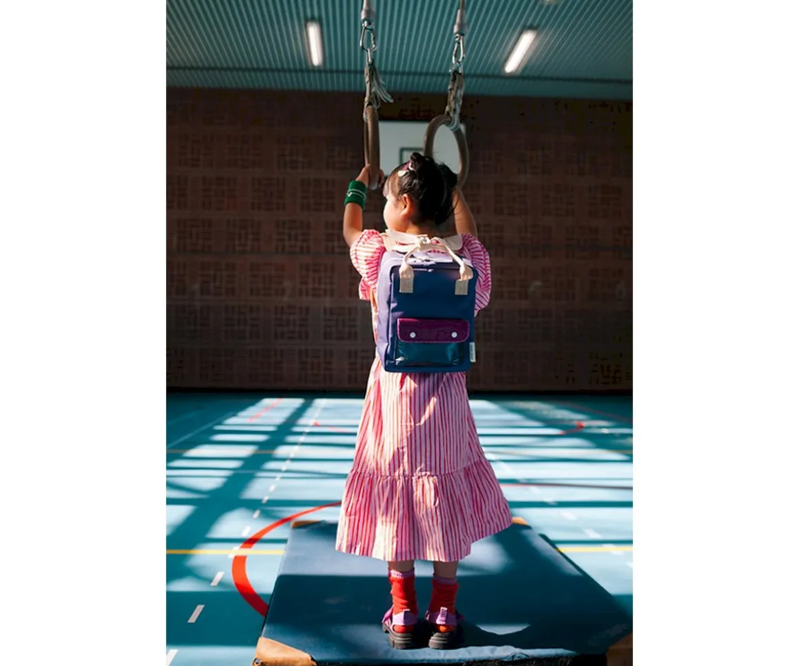 La mochila preescolar Better Together Pennant Purple de Sticky Lemon está hecha de botellas PET recicladas con forro impermeable, con original y único estampado, perfecta para ir al cole o de excursión.