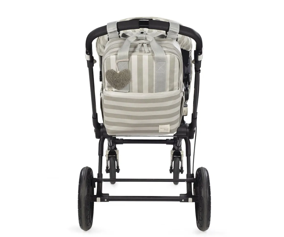 La mochila incluye 2 asas cortas ajustables que facilitan la colocación en cualquier modelo de silla de paseo, asas de mano y correas acolchadas para colgar en la espalda y llevarla contigo cómodamente.