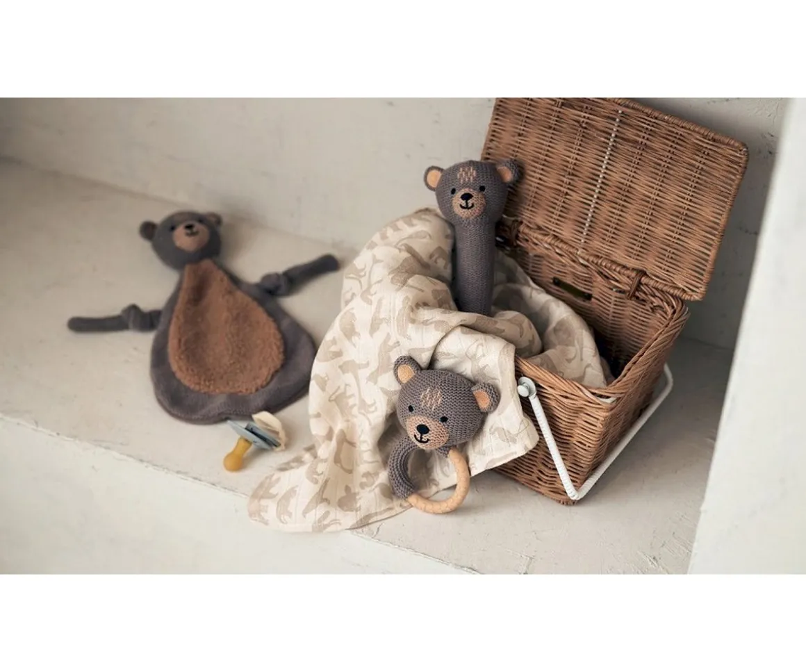 Este precioso osito es un mordedor, para que los peques de la casa puedan aliviar sus encías durante el proceso de dentición; y también es un sonajero, pues cuenta con una campana en su cabecita. Tiene la forma y el tamaño perfecto para que los peques puedan manejarlo con facilidad.