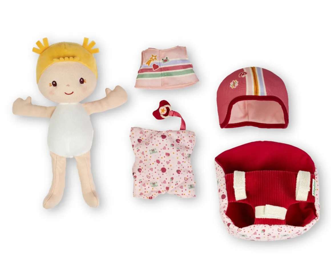 - Incluye: portabebés ajustable, muñeca Lena, casco de tela, chaleco de tela,chupete magnético, vestido