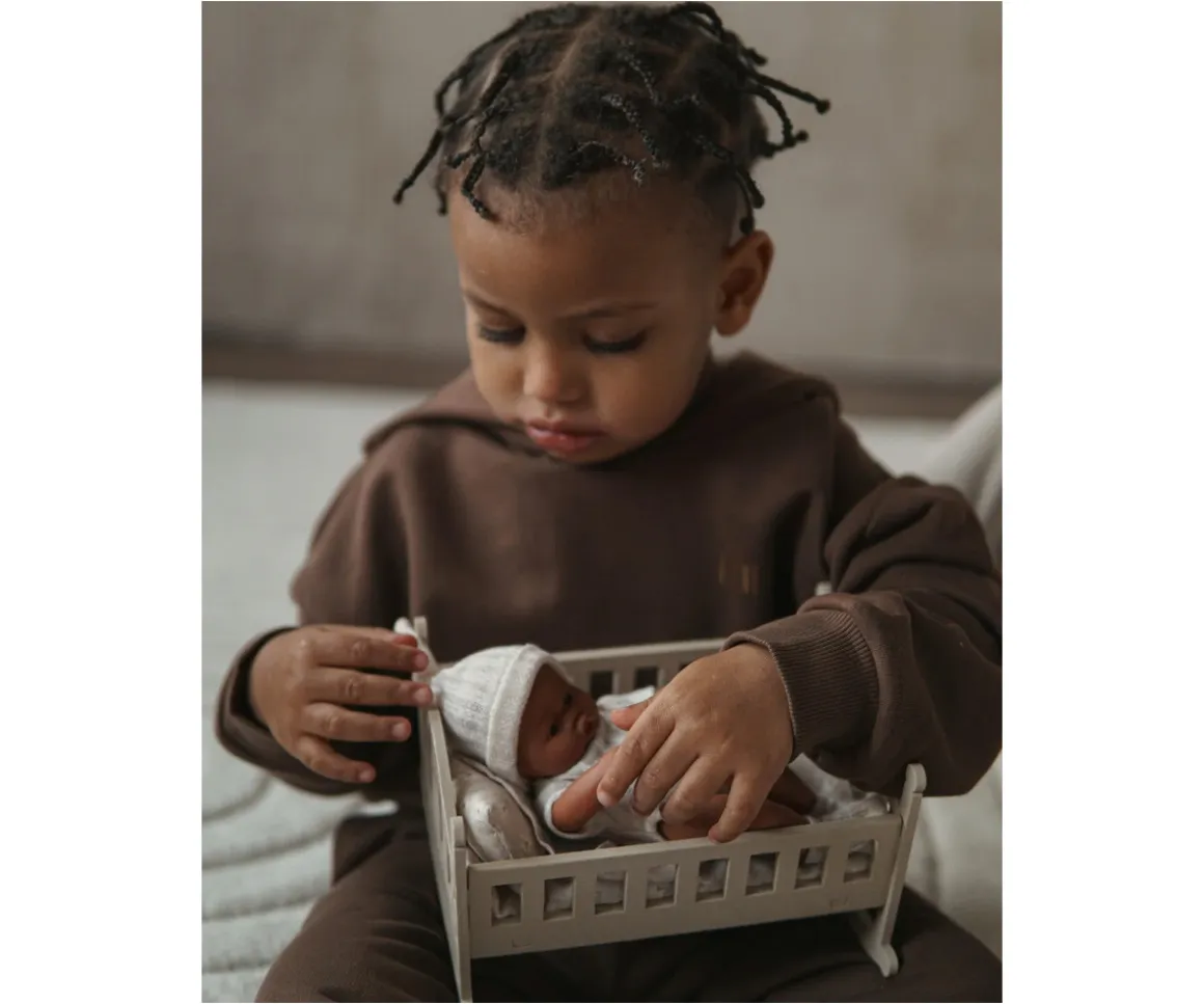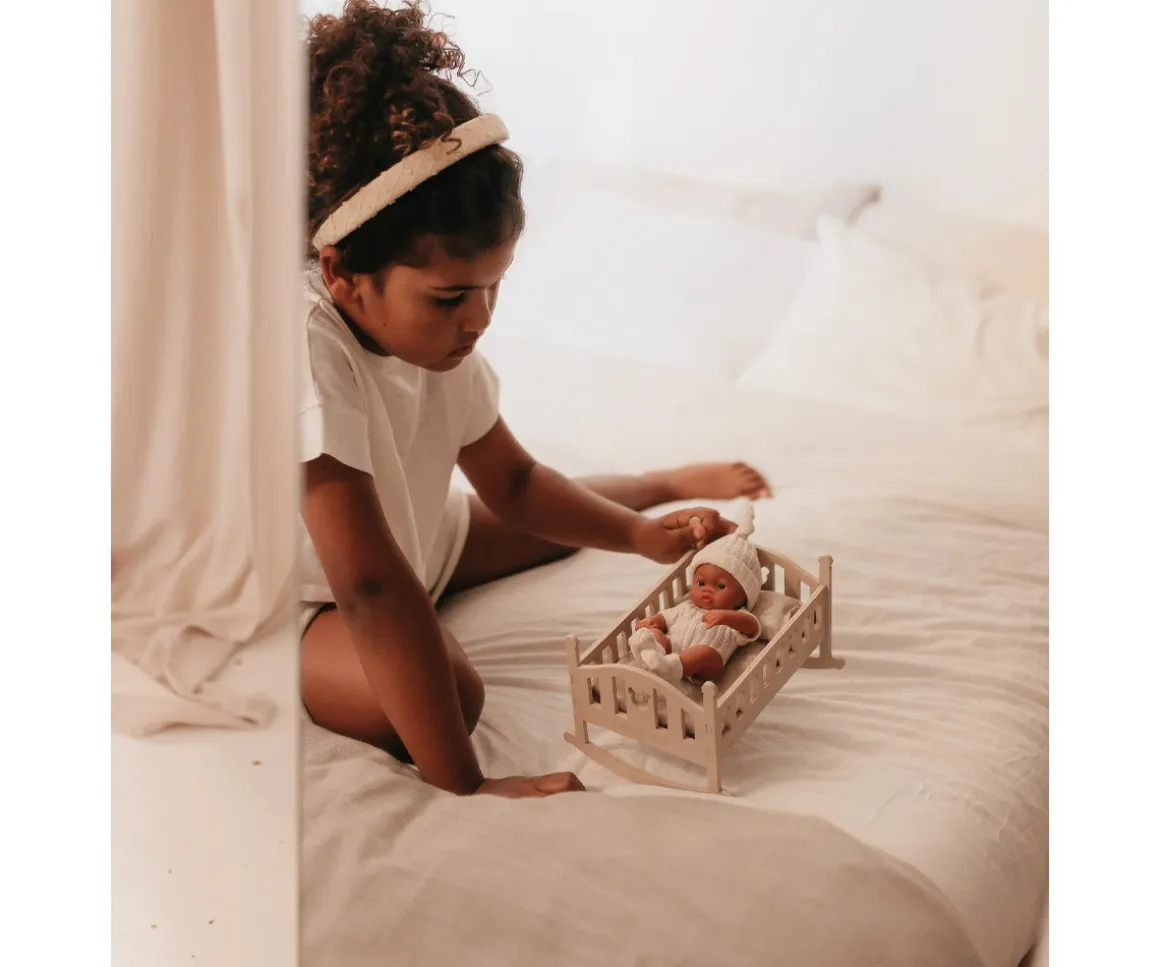 Cada Lupita incluye una preciosa cuna mecedora de madera y un set de ropa de cama compuesto por colchón, almohada y sábana, creando el escenario ideal para el juego simbólico y las rutinas de cuidado.