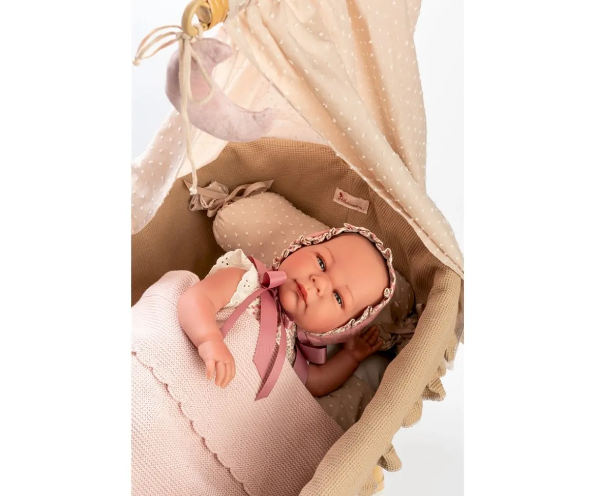 Precioso muñeco reborn Mauren de serie limitada acompañado de una mantita muy suave que lleva puesto un vestido con estampado de flores, un gorrito, un pantaloncito, unos zapatitos y un pañal.