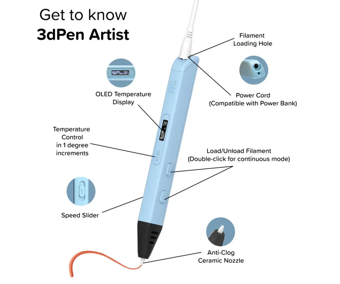 Está diseñado para fomentar el desarrollo de la creatividad, el aprendizaje STEM, así como para practicar la motricidad fina fortaleciendo el agarre y perfeccionando la destreza. Con el 3D pen artist dale vida 3D a cualquier cosa que imagines.