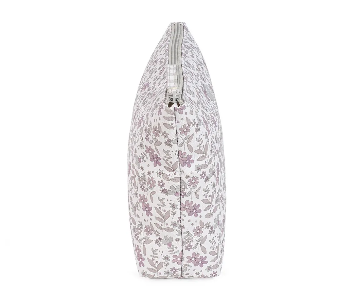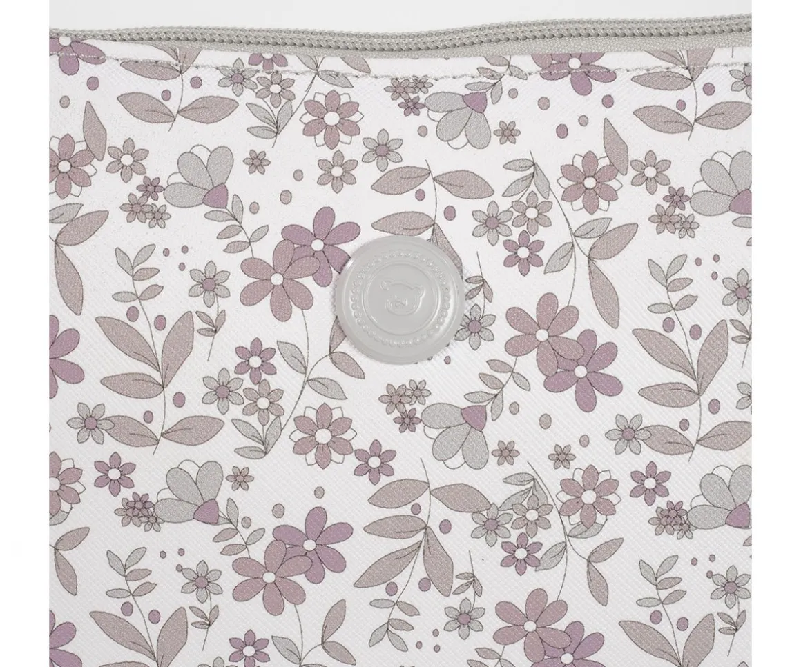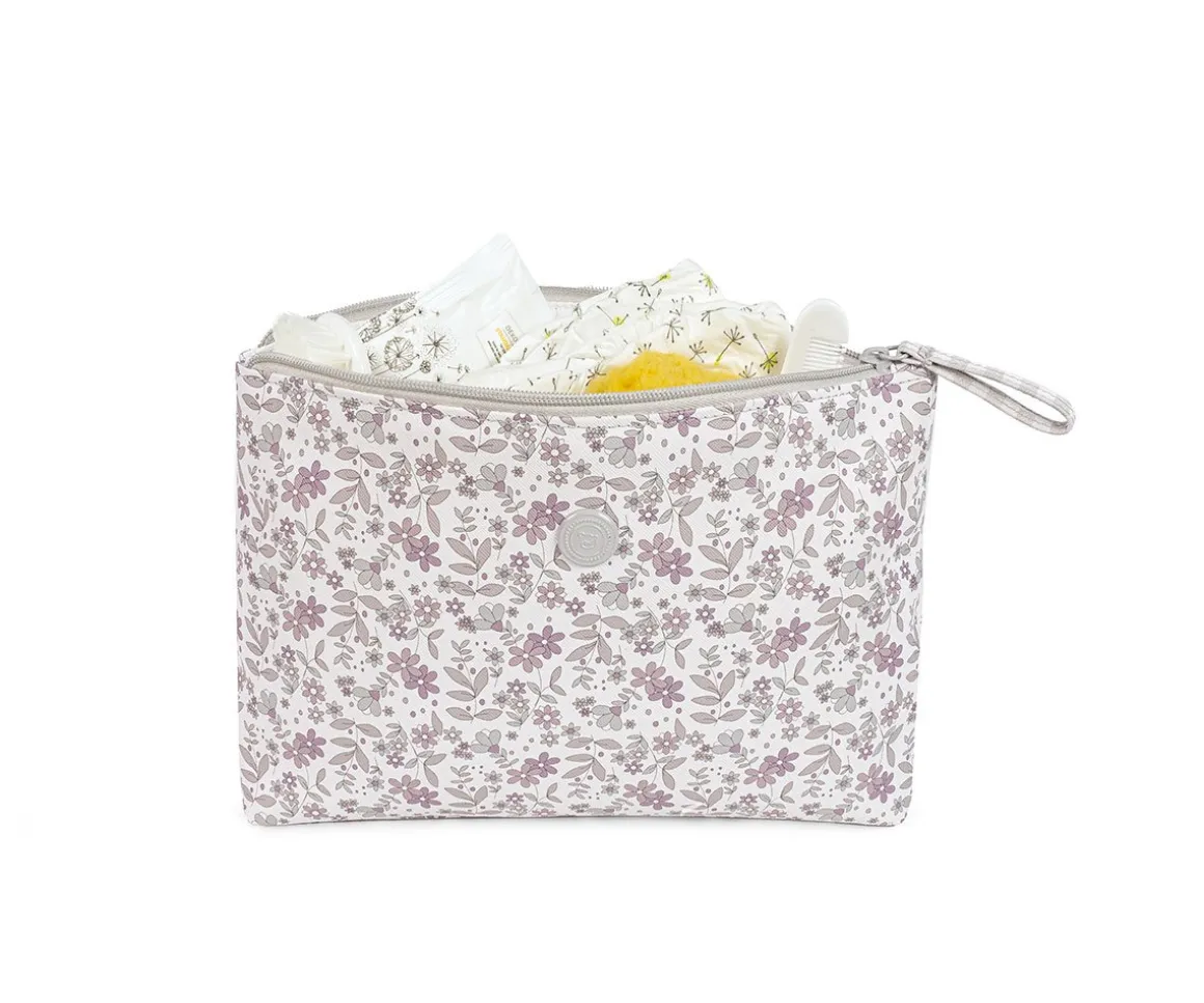 El neceser de bebé Delia es un bolso pequeño especialmente pensado para llevar todos los productos de aseo de nuestro bebé al salir de casa. Es un modelo único con mucho estilo para adecuarse a lo que necesitas. Está elaborado en resistente y suave polipiel impresa con flores y con una forma para acomodar fácilmente en el bolso canastilla a un lado. Es un diseño bonito, simple y cómodo que ofrece un espacio pequeño pero preciso para llevar justo lo que necesitas para la higiene de tu bebé, peine, lociones y otros objetos que por ser tan pequeños a veces se pierden dentro del bolso canastilla.