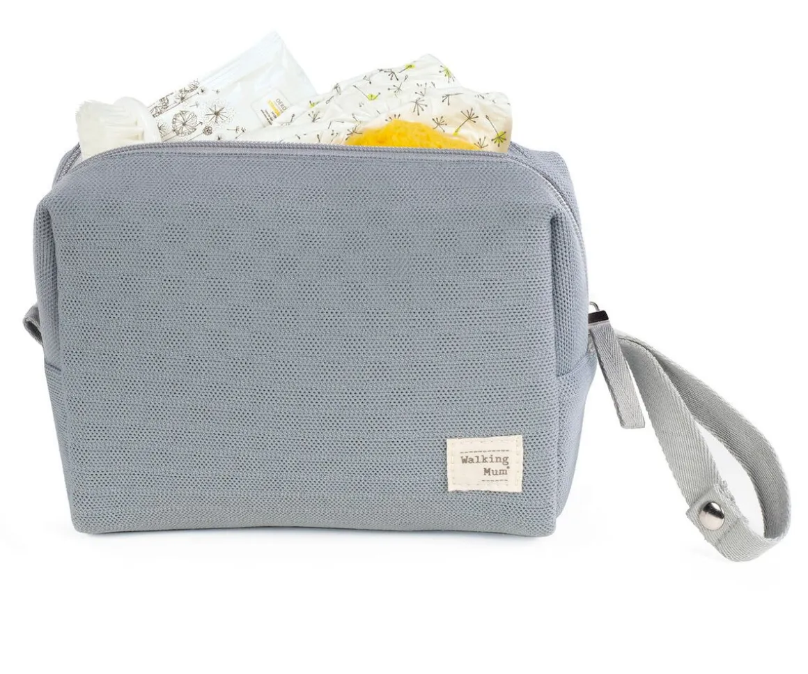 Neceser muy práctico de Walking Mum, para llevar todos los productos de aseo de tu bebé. Tiene un cierre seguro de cremallera para evitar que algo pueda salirse, y una práctica asa lateral para colgar.