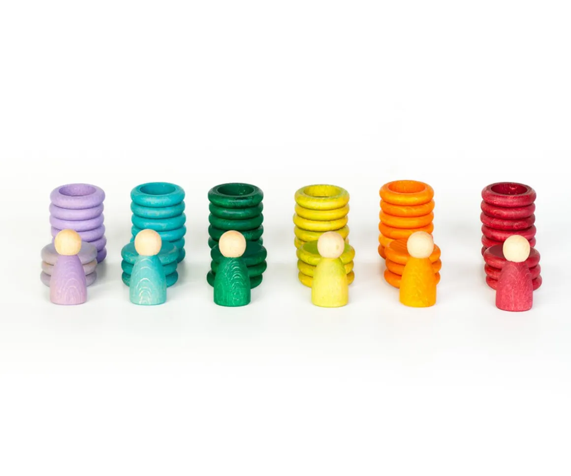 Las seis anillas de cada color permiten esconder completamente al Nin llegando a taparlo por completo, a la vez las monedas hacen de límite para hacerlo subir, cubrir a medias, descubrir del todo… Aparezco, desaparezco, me escondo, me cubro, me reencuentro… Un material sencillo que permite múltiples posibilidades de juego.
