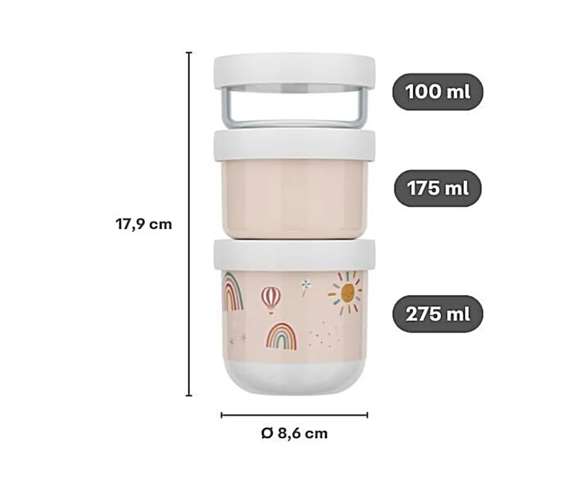 Disfruta de tu merienda o almuerzo en cualquier lugar con las cajitas snack a prueba de fugas y fáciles de abrir y cerrar. Se pueden apilar y son perfectas para separar salsas, yogures ó tus snacks preferidos.