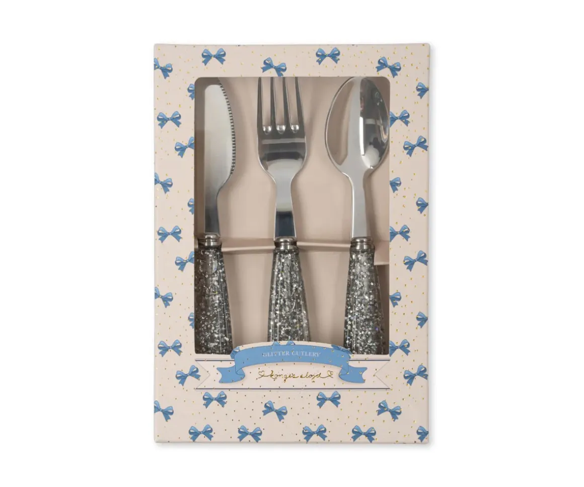 El set de cubiertos glitter de Konges Slojd está formado por una cuchara, un tenedor y un cuchillo con preciosos mangos redondeados y brillantes.