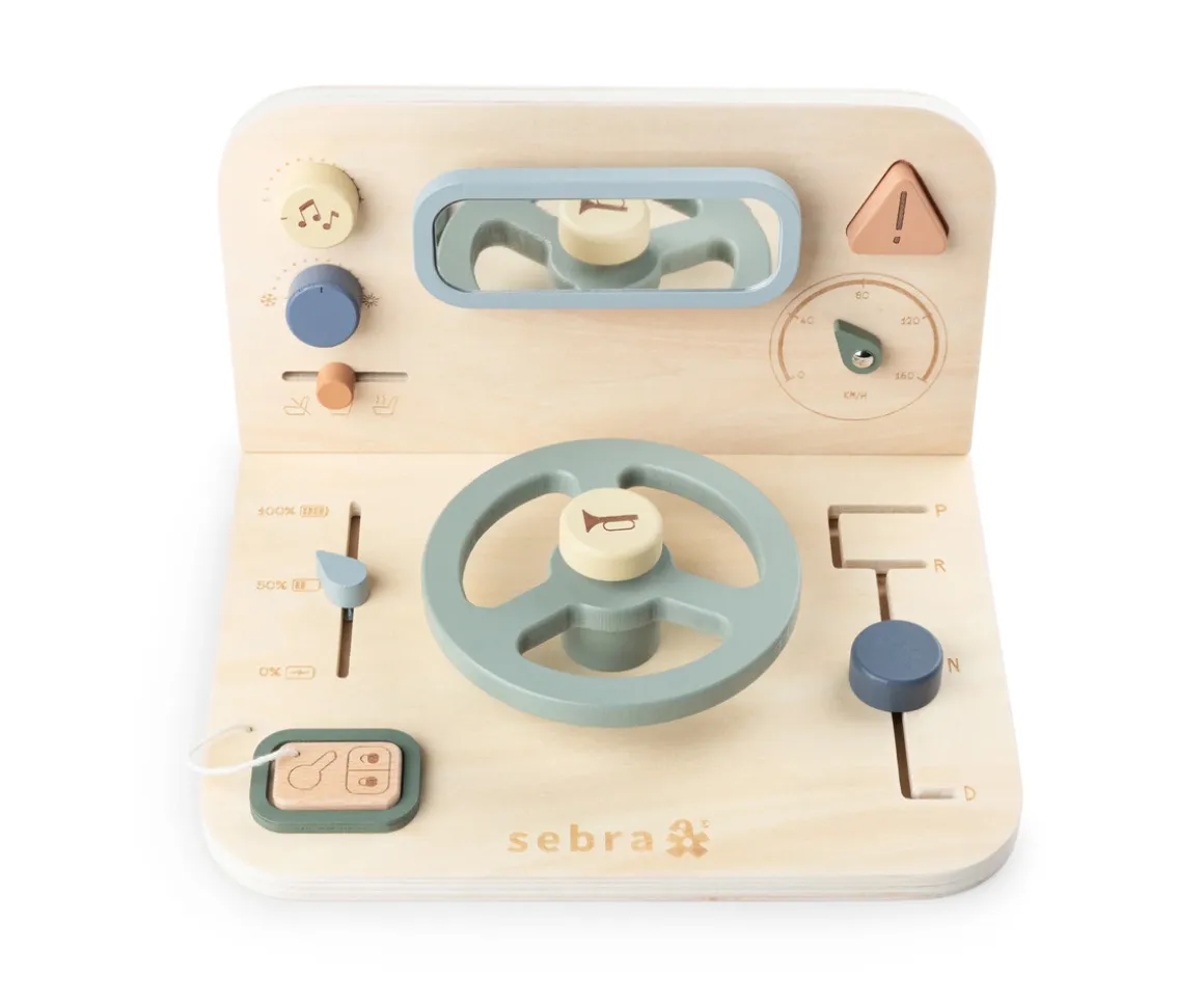 El panel de actividades coche de madera Sebra ofrece a los pequeños amantes de los vehículos una experiencia de juego única, llena de imaginación, movimiento y aprendizaje. Fabricado en madera certificada de alta calidad, este tablero reproduce los detalles de un coche real con un encantador estilo nórdico.