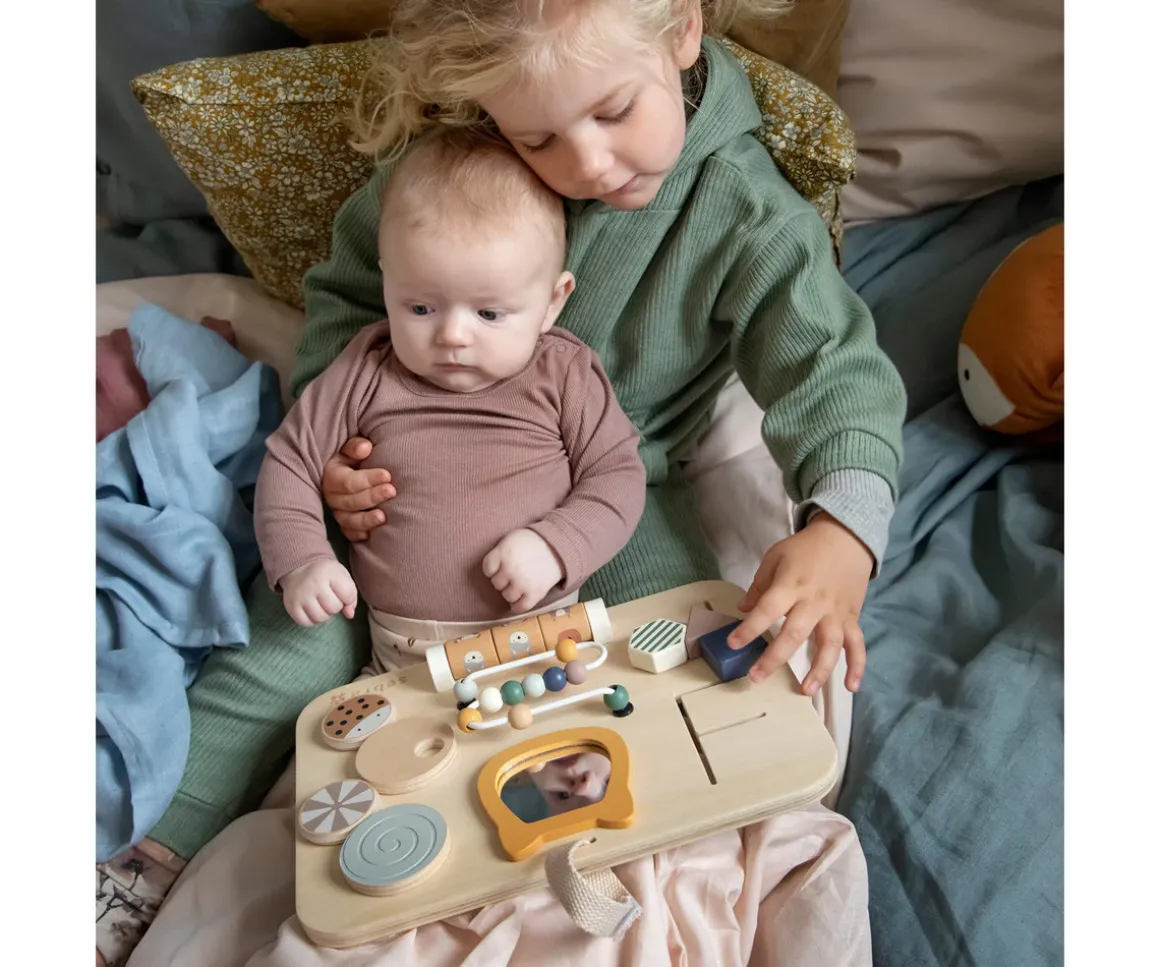 Descubre el panel de actividades de madera de Sebra, un juguete versátil y duradero diseñado para estimular la curiosidad y el desarrollo motriz de los más pequeños.