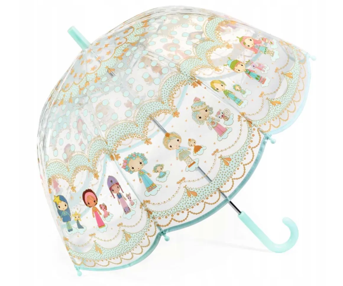 Bonito paraguas transparente en color menta y dorado con ilustraciones de la colección de muñecas Tinily.