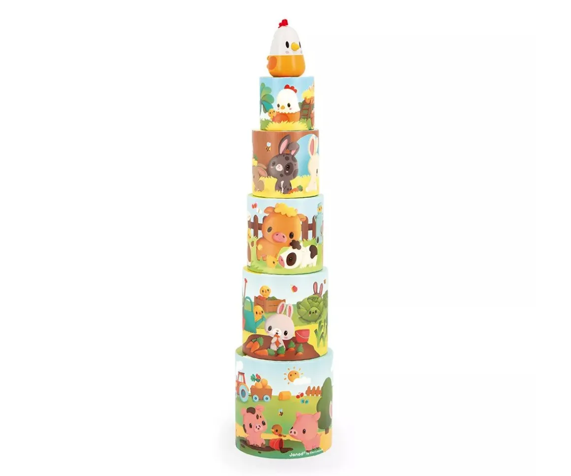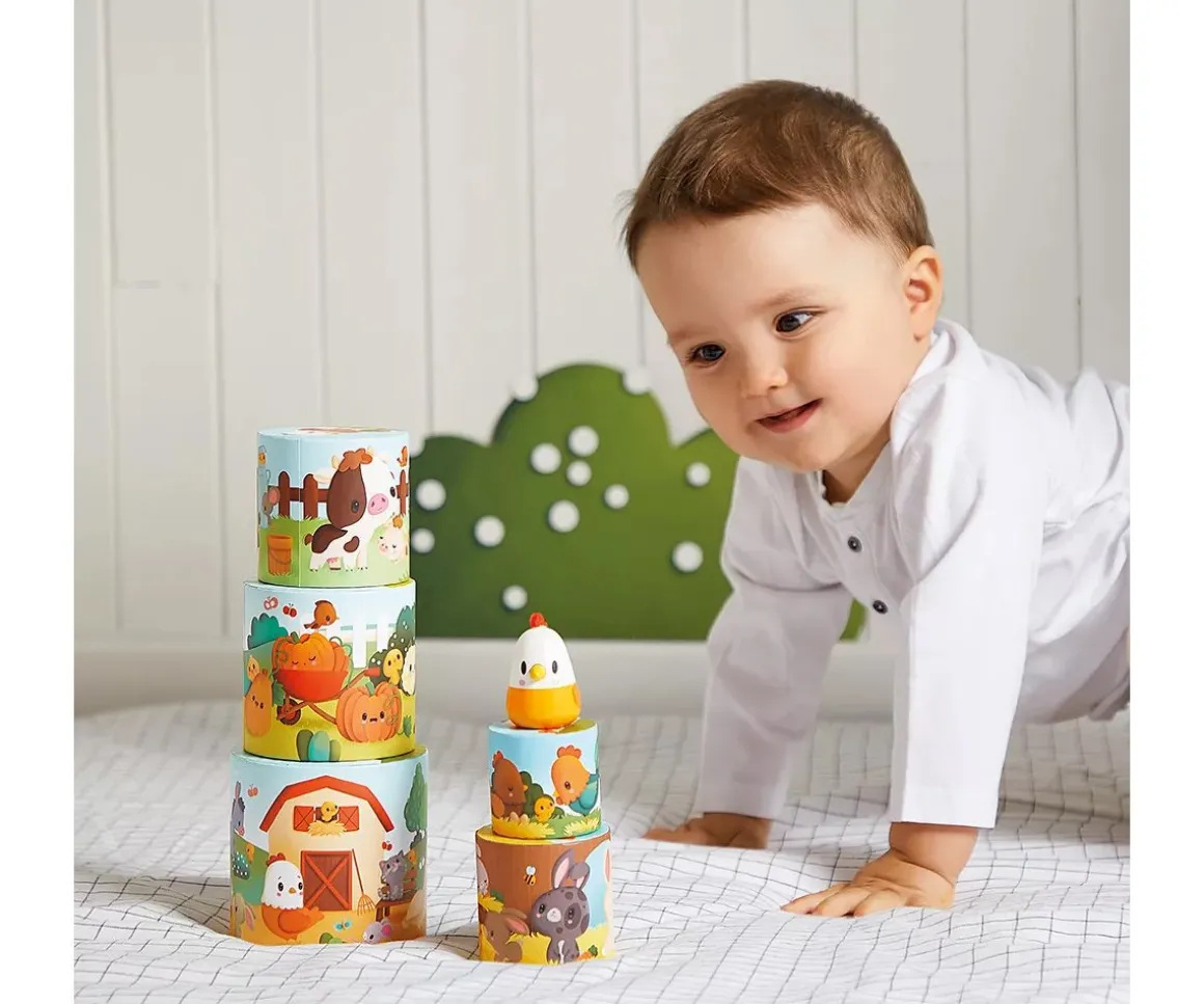 - Incluye 5 piezas para apilar y un pollito de madera
