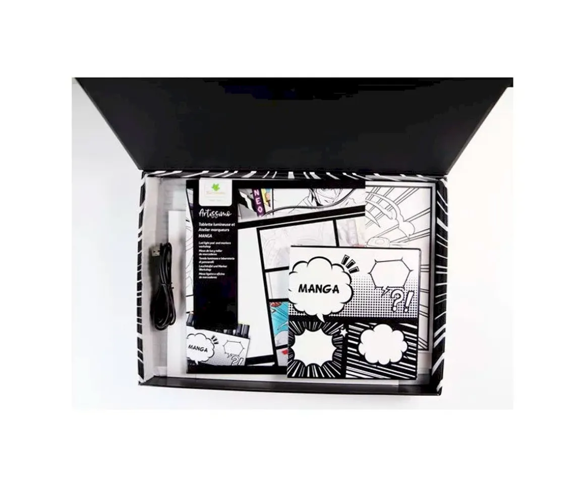Este set es un verdadero taller para crear tu propio manga gracias a la tableta luminosa y los marcadores de alcohol para usar en los papeles de diseño.
