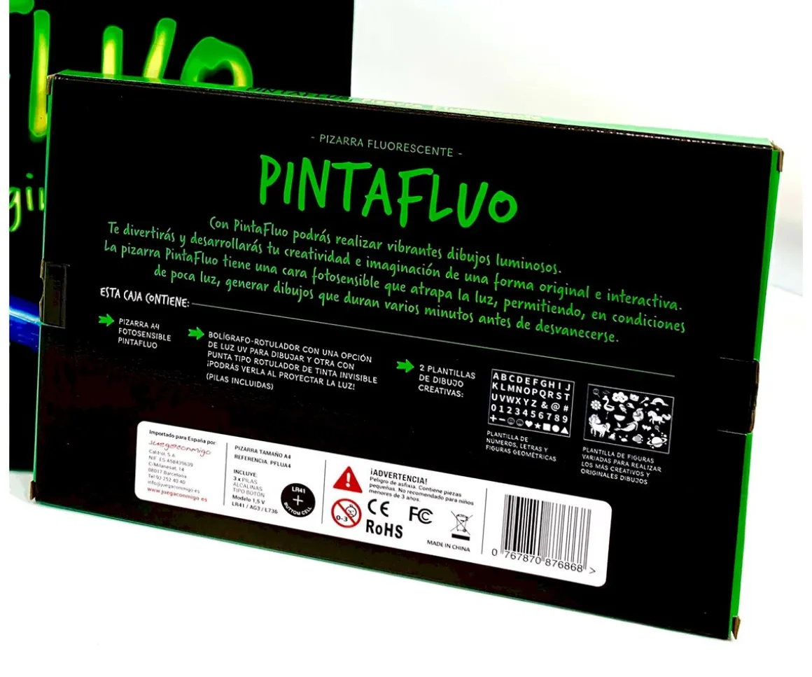 - 2 x Doble lápiz, una opción de luz para dibujar (con pilas incluidas) y otra con punta tipo rotulador con tinta invisible (podrás verla al proyectar la luz)