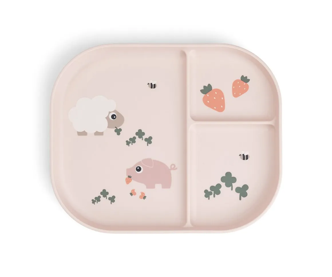 Divertido plato con compartimentos para poder separar los alimentos y que no se mezclen. Con diseño de los agradable animales de la colección Tiny Farm de Done by Deer, ¡será el favorito de los más pequeños!