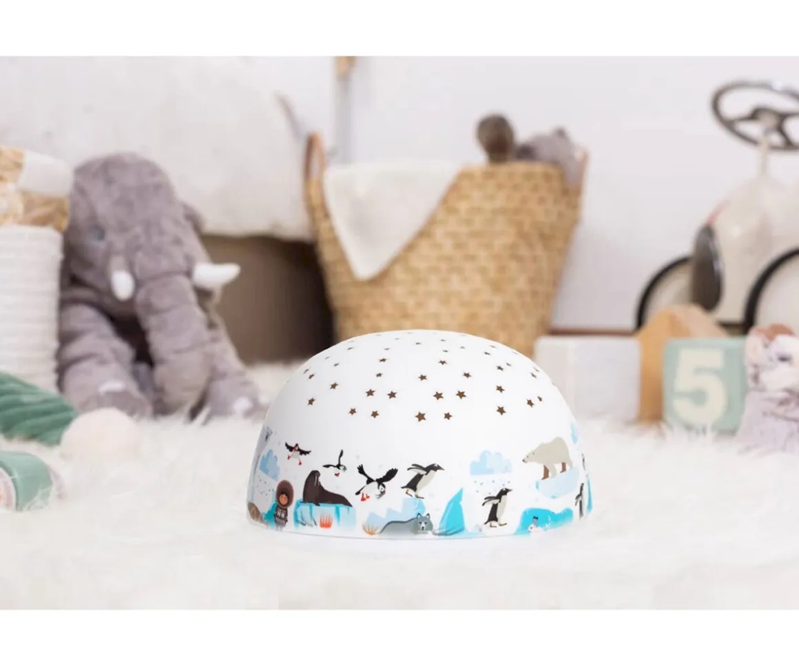 El proyector de luz Olala es el complemento perfecto en la mesita de noche de tu peque y le ayudará a dormir más tranquilo y podrá conciliar el sueño más rápido gracias a sus 5 melodias y diseño con mótivos del Polo Norte.