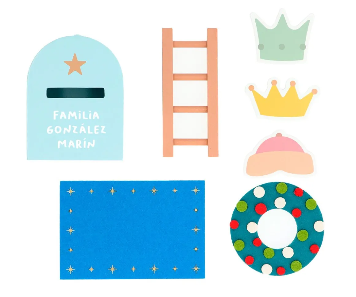 - Incluye: buzón mágico, escalera, corona puerta, 3 coronas reyes magos, alfombra
