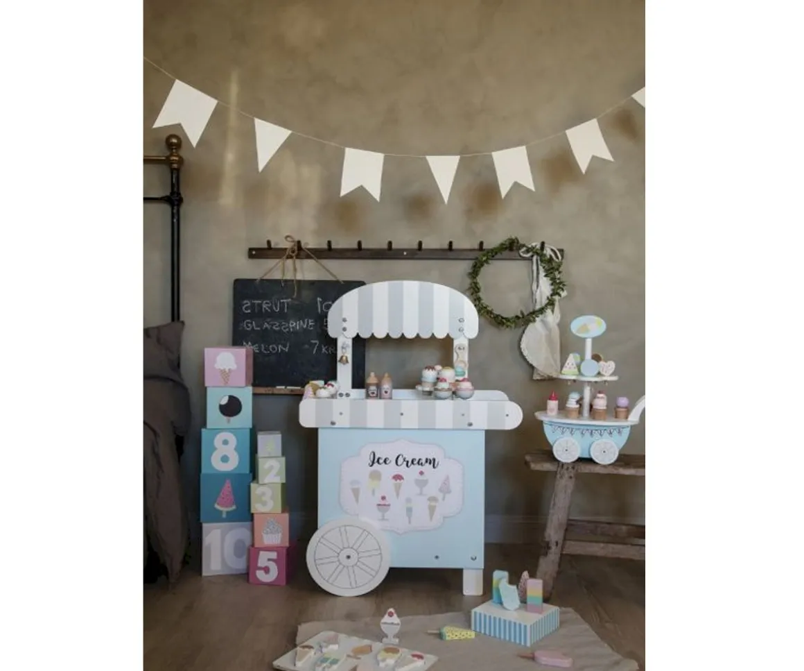 - Contiene: 1 heladería de madera con ruedas, 1 cucharada de helado, 1 salsa de fresa, 1 salsa de chocolate, 3 helados con trozos apilables, 3 paletas de hielo de distintos sabores, 2 vasos para helado,1 campana