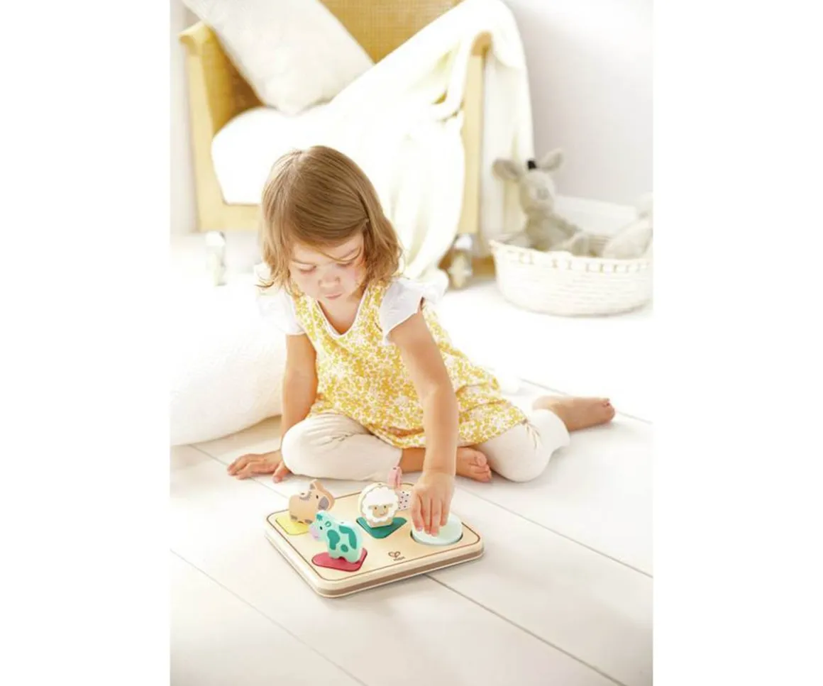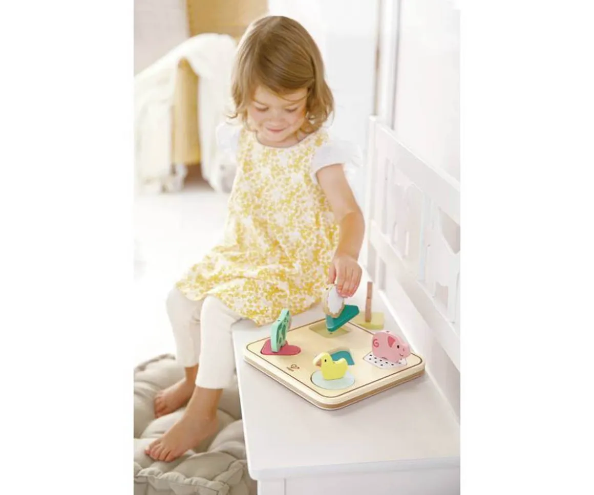 Divertido Puzzle de madera donde los más pequeños podrán explorar todos los divertidos sonidos levantando las piezas. Hay espacio para cinco animales de granja en el puzzle y con él podrán conocer y emparejar sus diferentes sonidos de cada uno. Si el animal encaja en la forma prevista, se escucha el sonido del animal. Al mismo tiempo que se divierten, se entrenan sus habilidades motoras y aprenden sobre las formas y los colores.