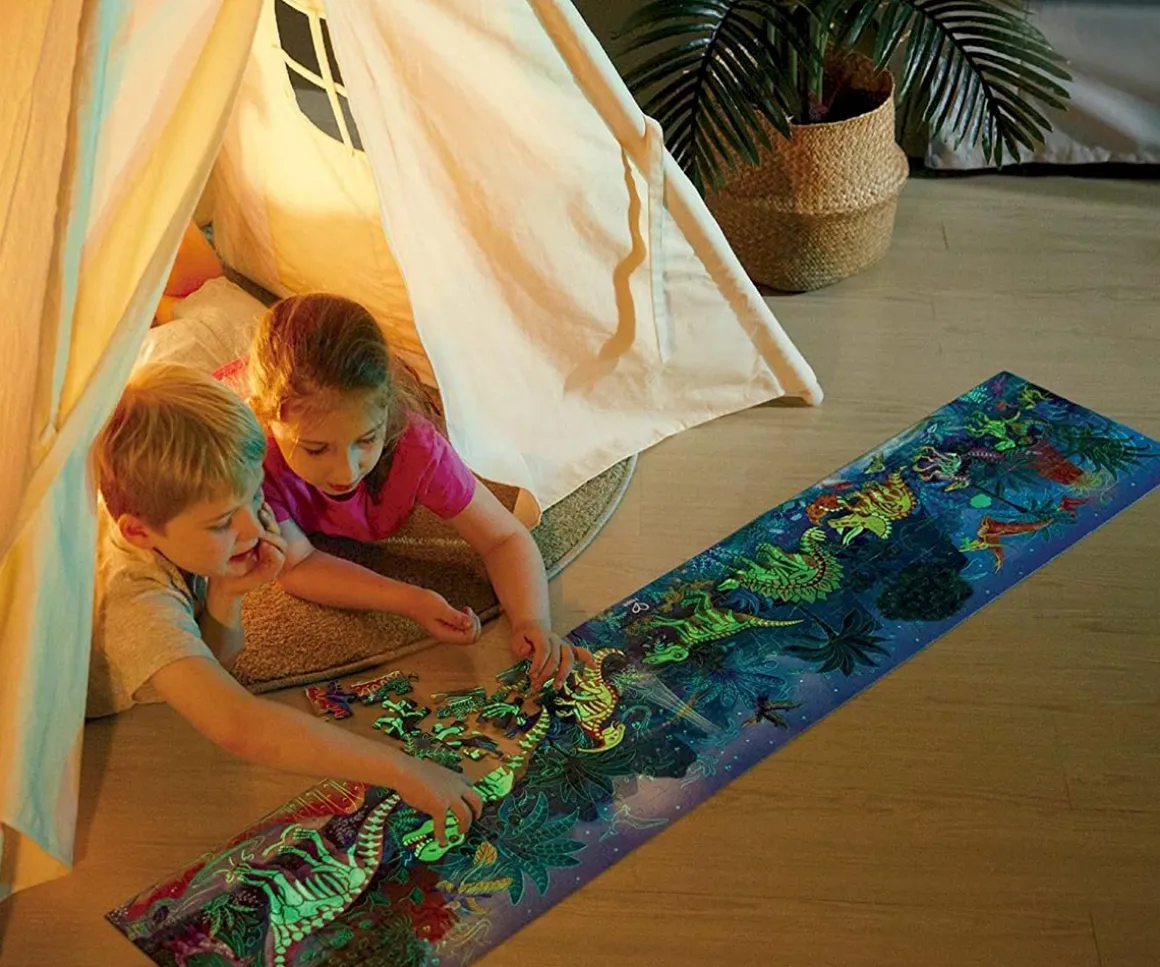 Descubre los dinosaurios más espectaculares con este bonito puzzle de 200 piezas ¡que brilla en la oscuridad! Observa cada detalle y conoce a cada uno de ellos con esta bonita ilustración de 1,5 metros y sus 10 cartas con sus nombres y características. ¿Podrás encontrarlos a todos?