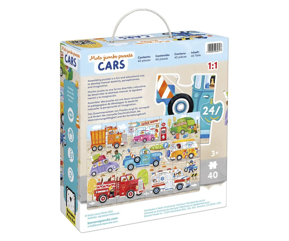 Este puzzle Jumbo Moto Cars incluye 40 piezas y viene en una bonita caja con su ilustración y con una asa de cuerda para llevar contigo a cualquier lugar.
