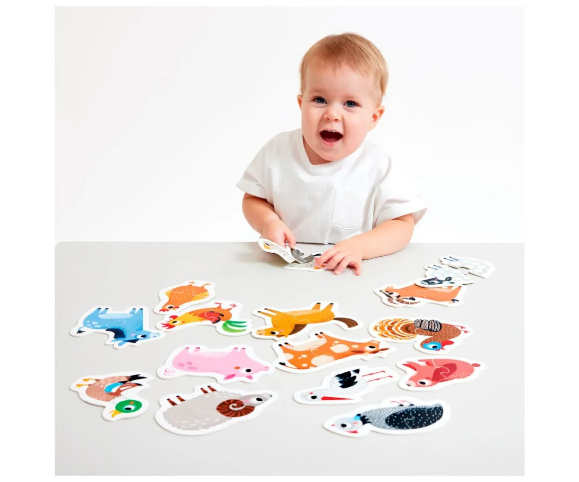 Este original puzzle contiene 15 animalitos de la granja. Cada uno está formado por 2 elementos grandes que los peques tendrán que unir.
