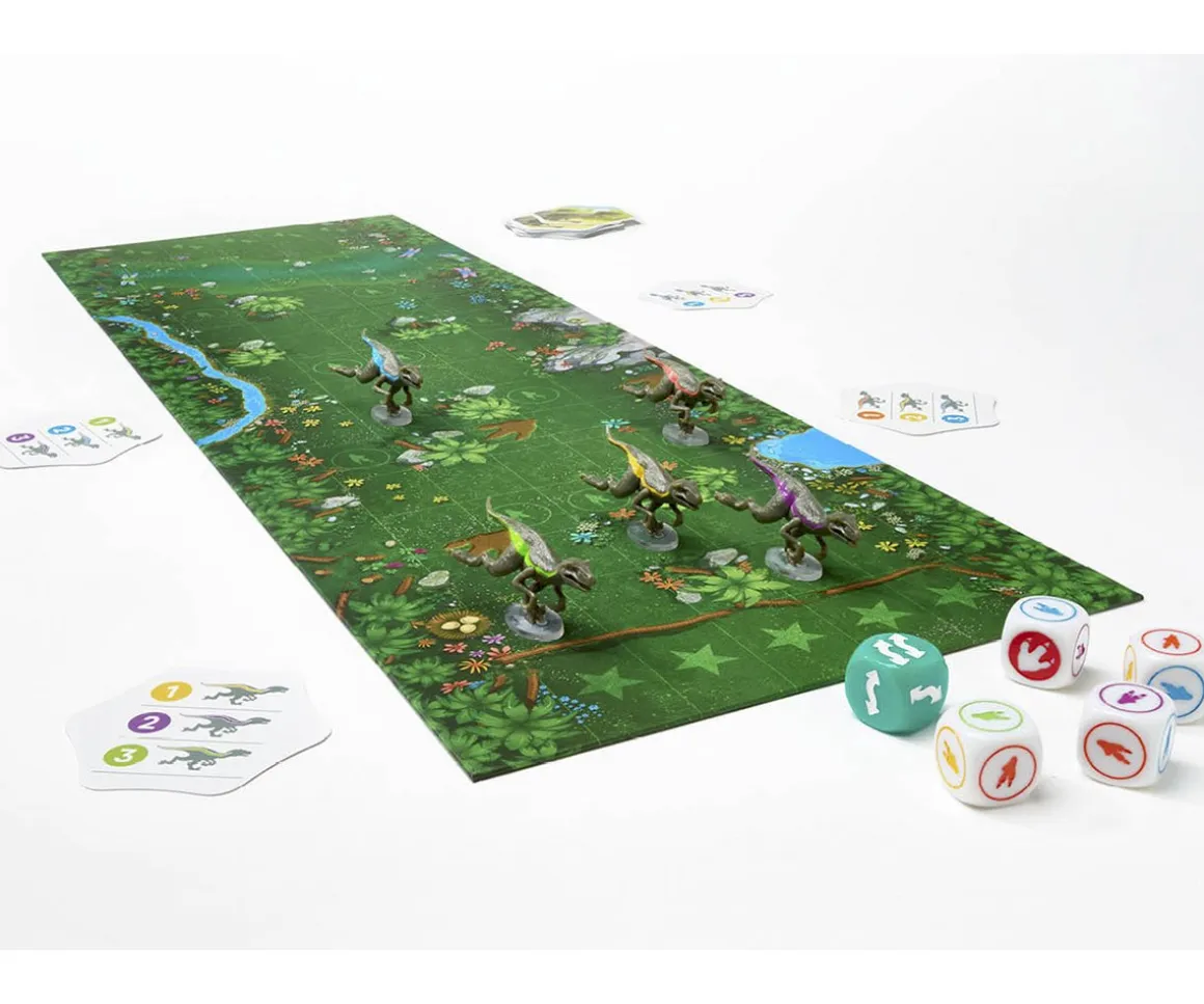 Usa los dados para hacer avanzar a los raptores adecuados paso a paso, presta mucha atención a los movimientos de tus oponentes e intenta que tus 3 mejores estén en las posiciones correctas cuando el primer raptor cruce la línea de meta.